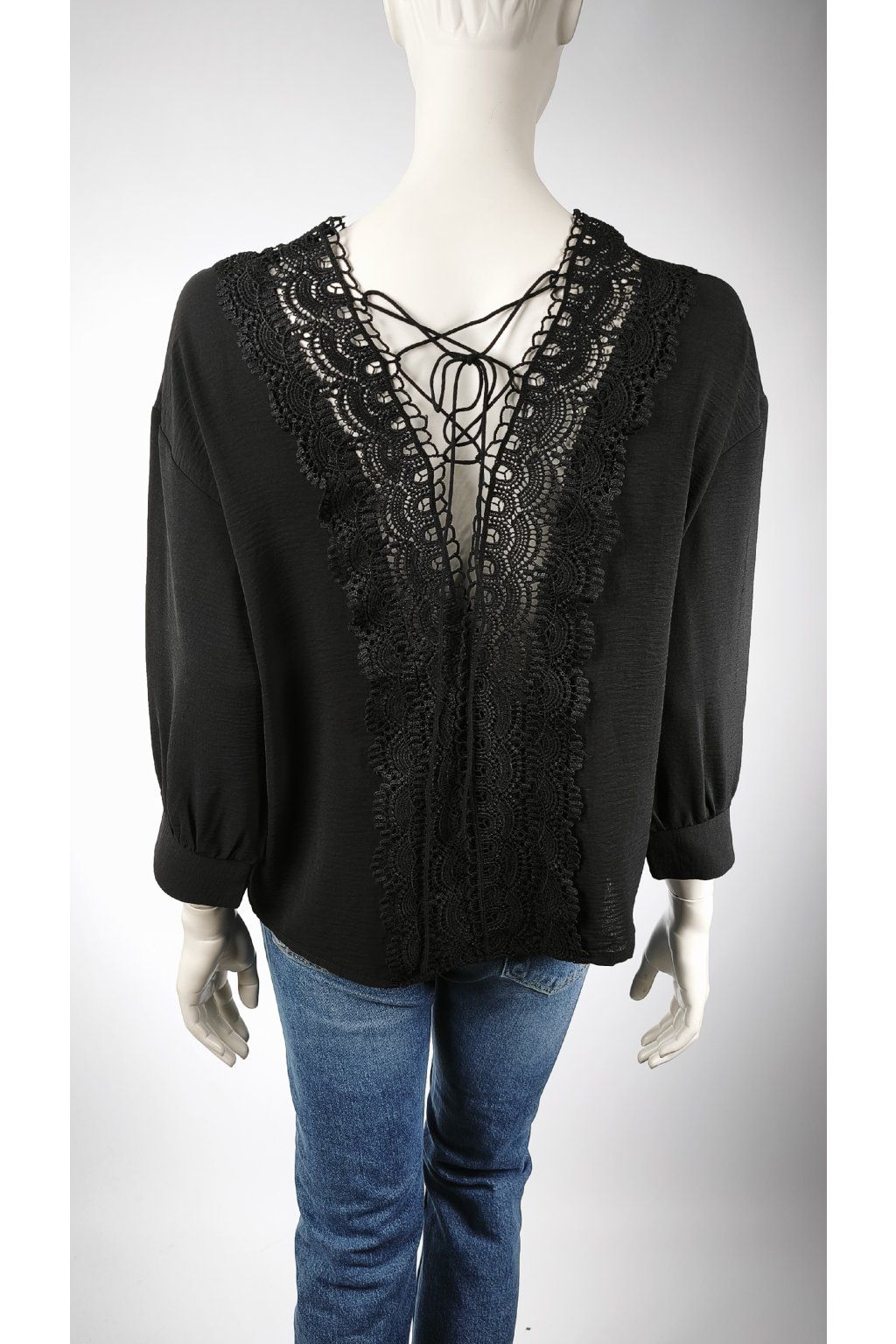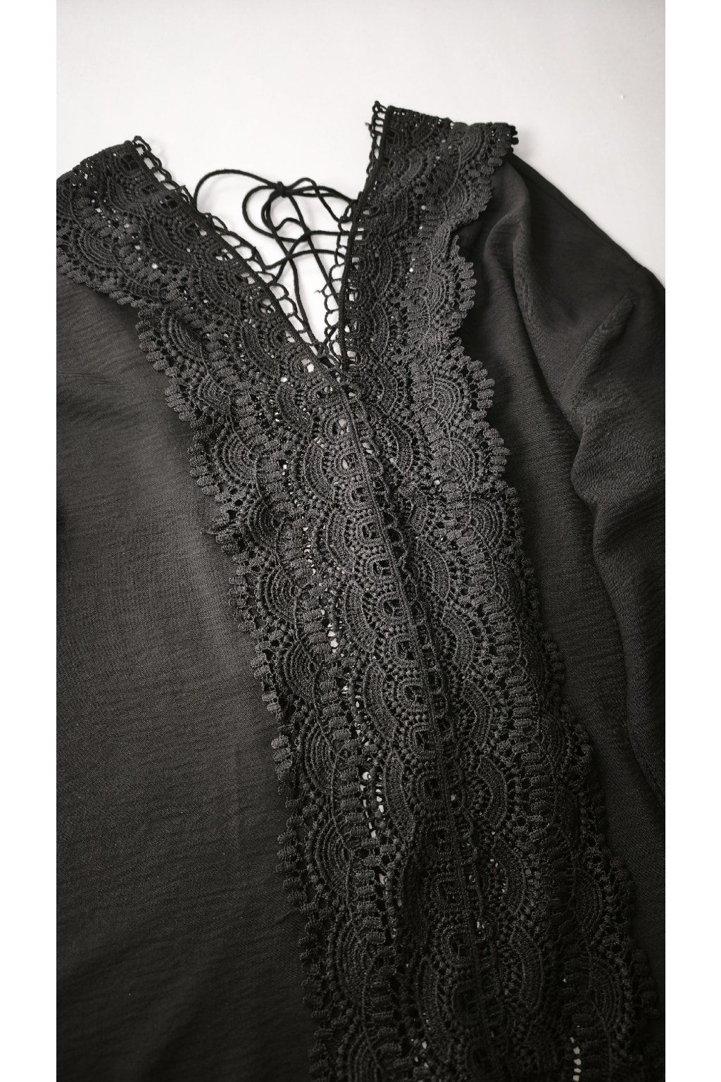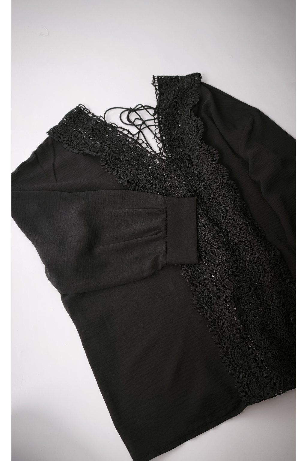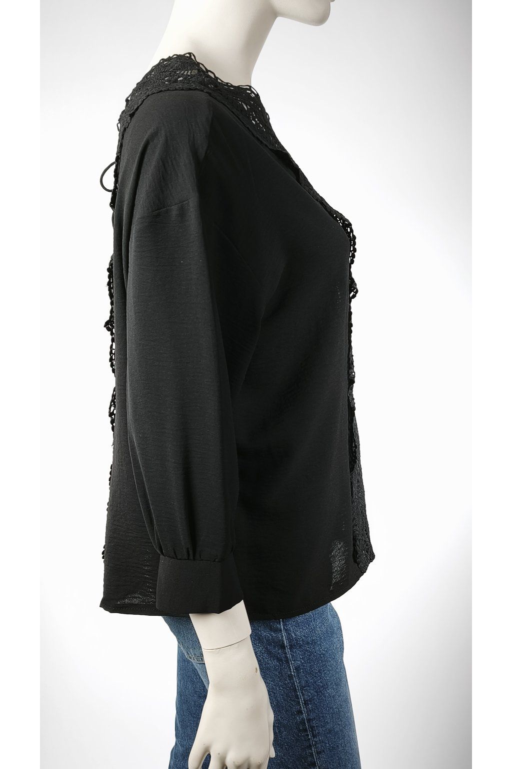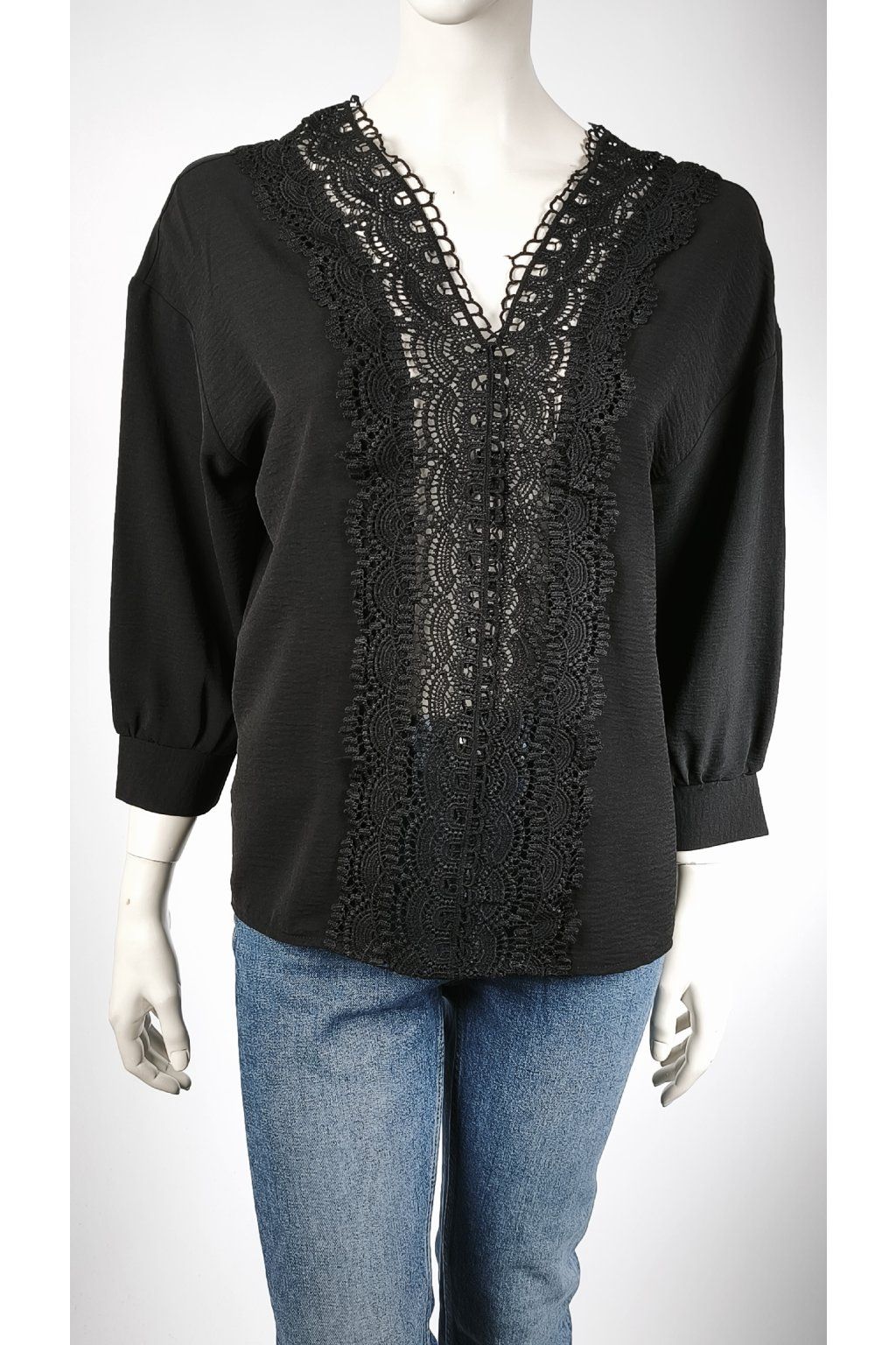 Táto čierna blúzka zaujme očarujúcou čipkou, ktorá elegantne zdobí prednú časť. Jemný polyesterový materiál poskytuje komfort a štýlový vzhľad, ideálny pre rôzne príležitosti.
