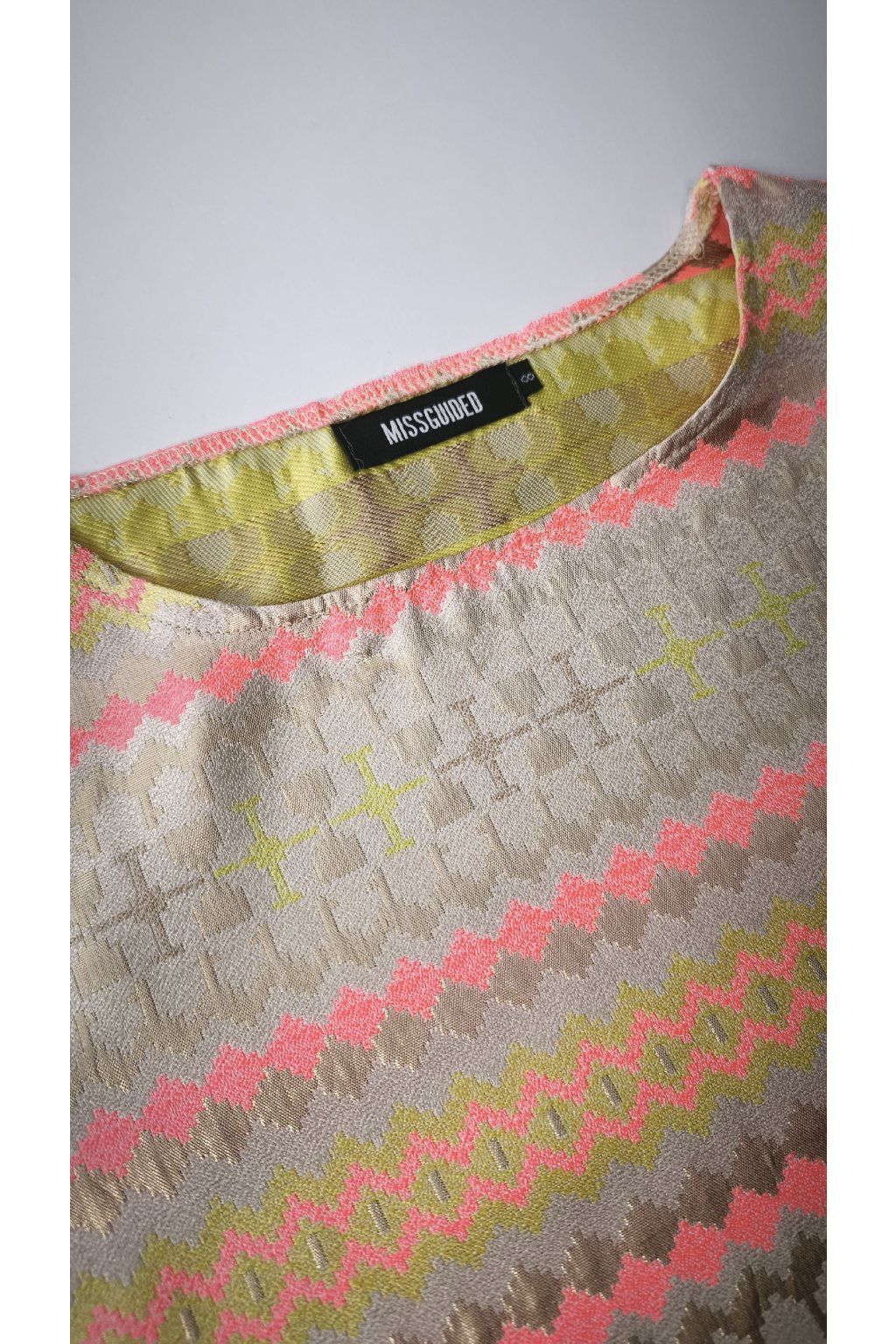 Táto elegantná viacfarebná blúzka od MISSGUIDED vyniká svojím výrazným geometrickým vzorom v odtieňoch ružovej, žltej a béžovej. Je ideálna na letné dni, vďaka krátkym rukávom a ľahkému polyesterovému materiálu.