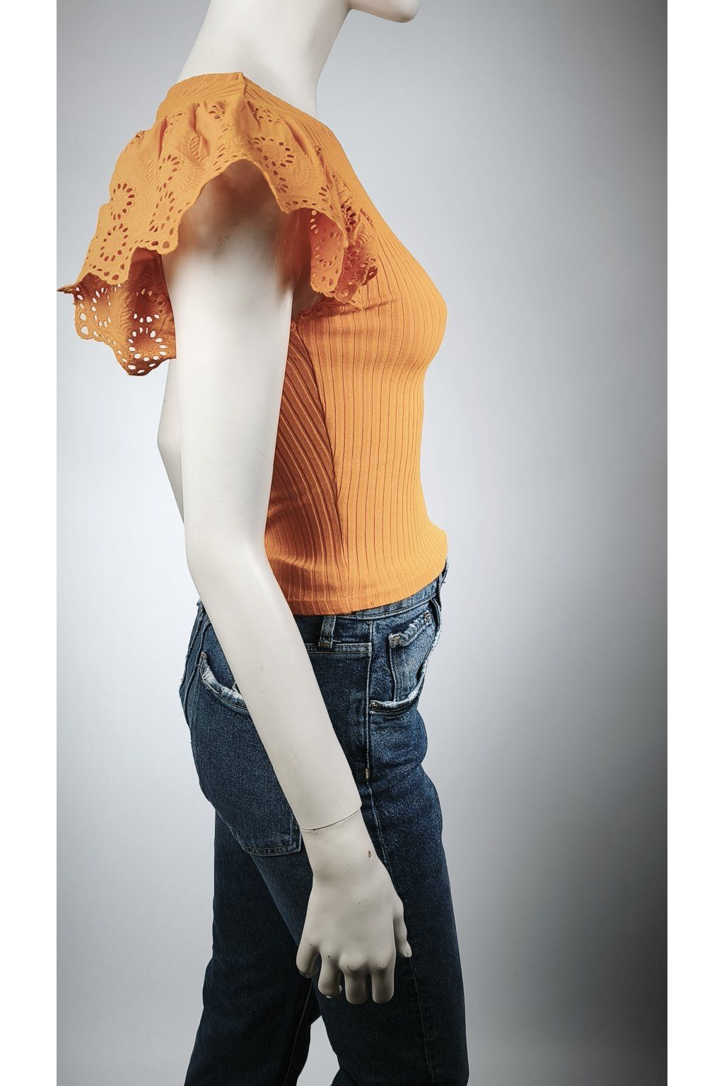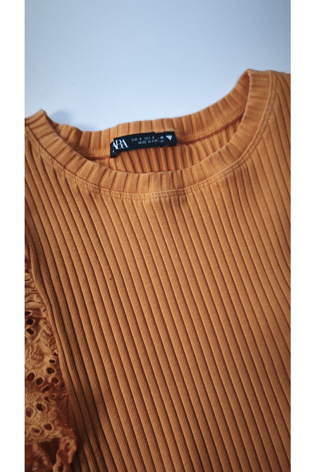 Táto oranžová blúzka od ZARA zaujme svojím rebrovaným dizajnom a nádhernými vyrezávanými rukávmi, ktoré dodávajú ženský šarm. Ideálna na letné dni, vynikajúco kombinuje pohodlie s eleganciou.