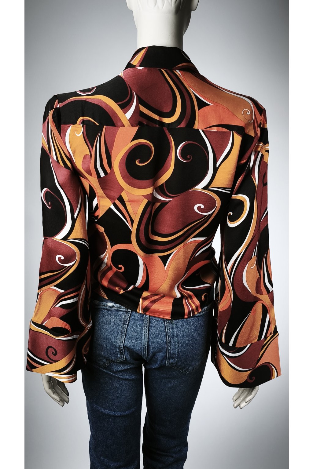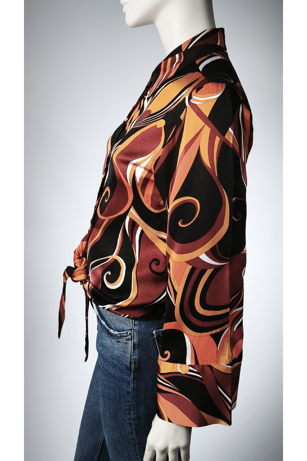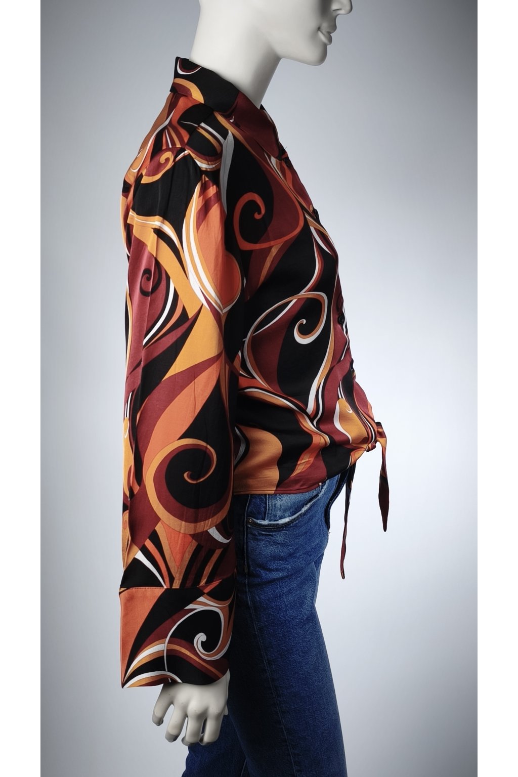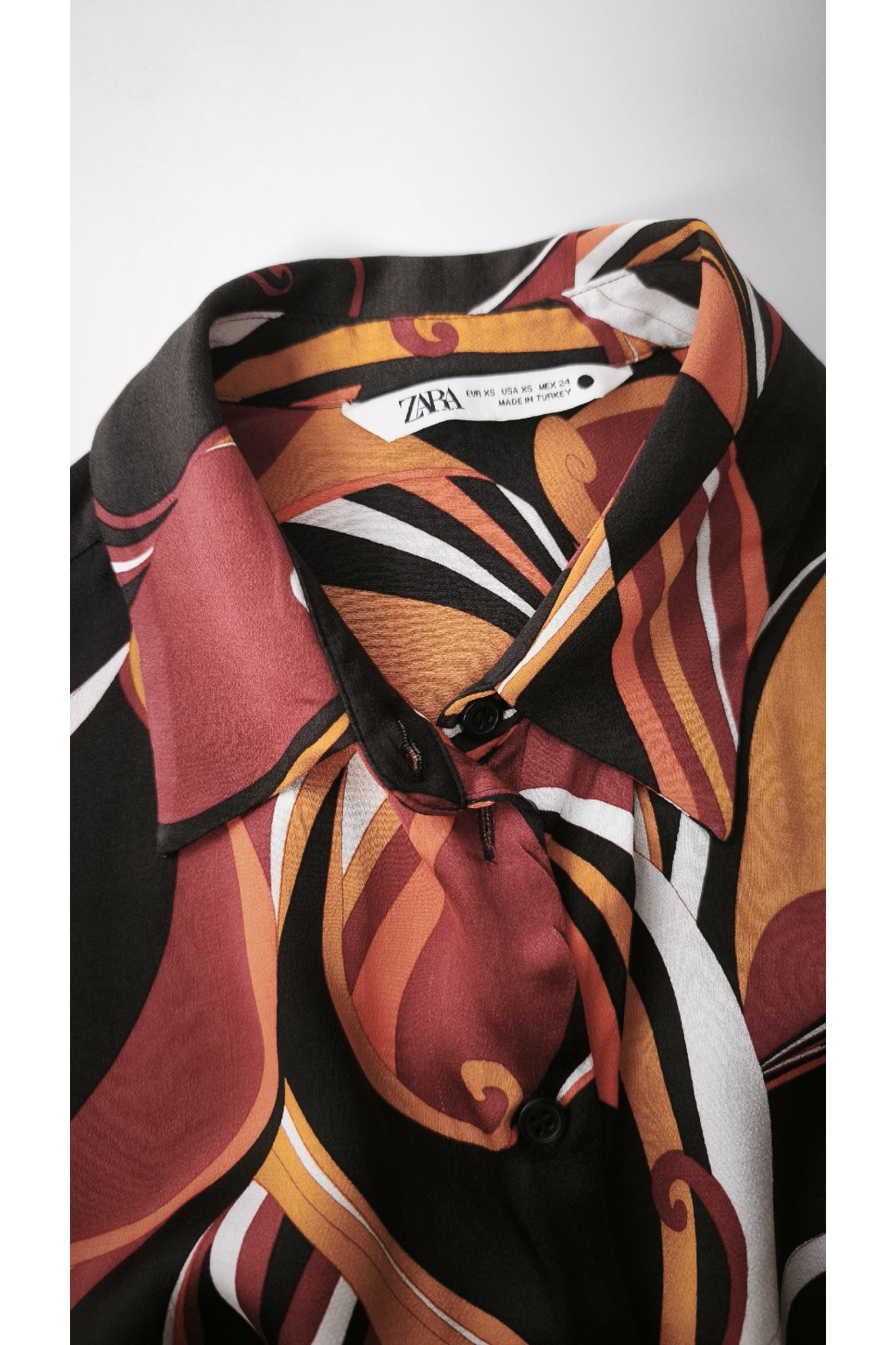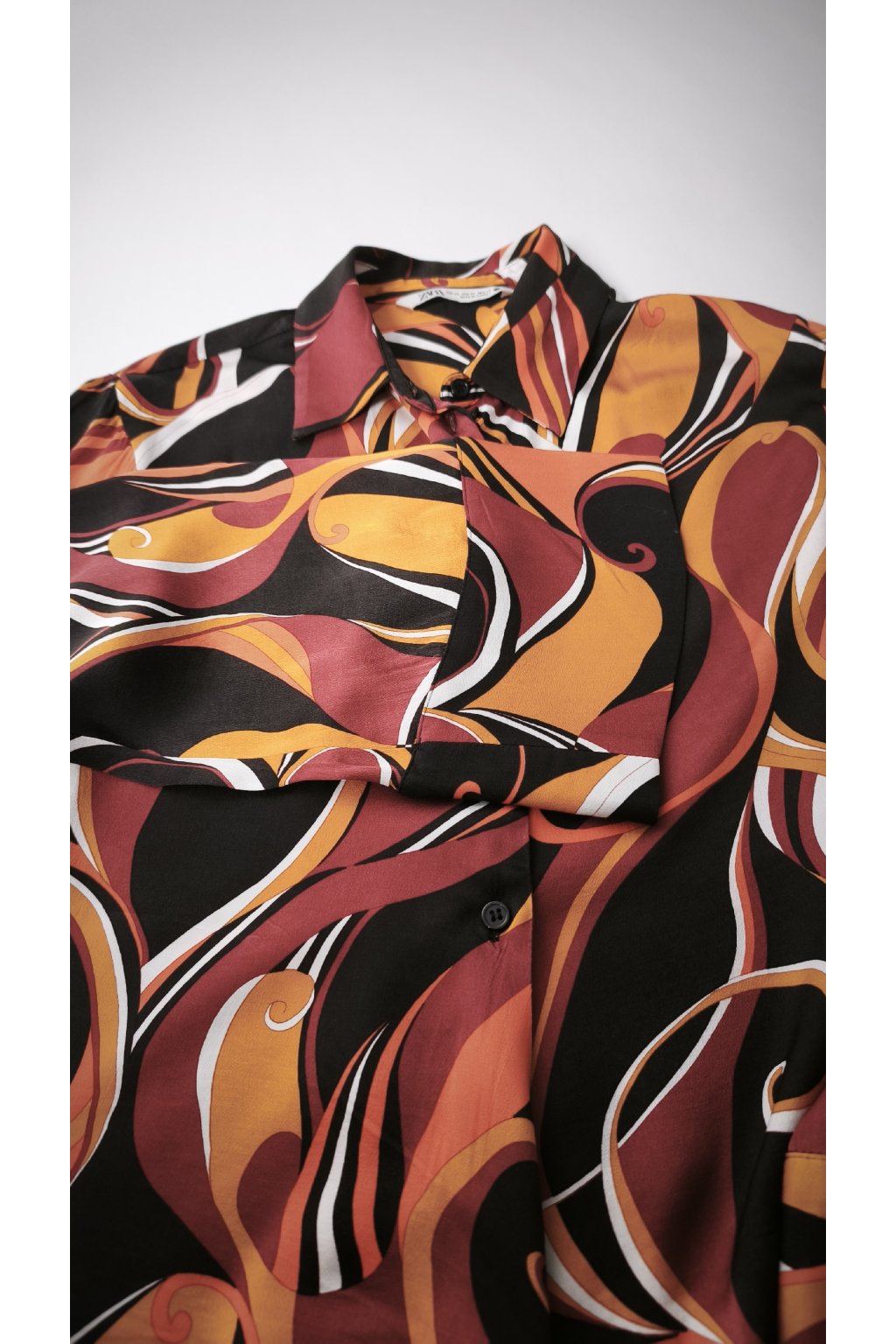 Táto viacfarebná blúzka značky ZARA upúta svojím dynamickým vzorom v odtieňoch oranžovej, čiernej a bielej. S dlhými rukávmi a klasickým golierom je ideálna na zvýraznenie vášho štýlu.