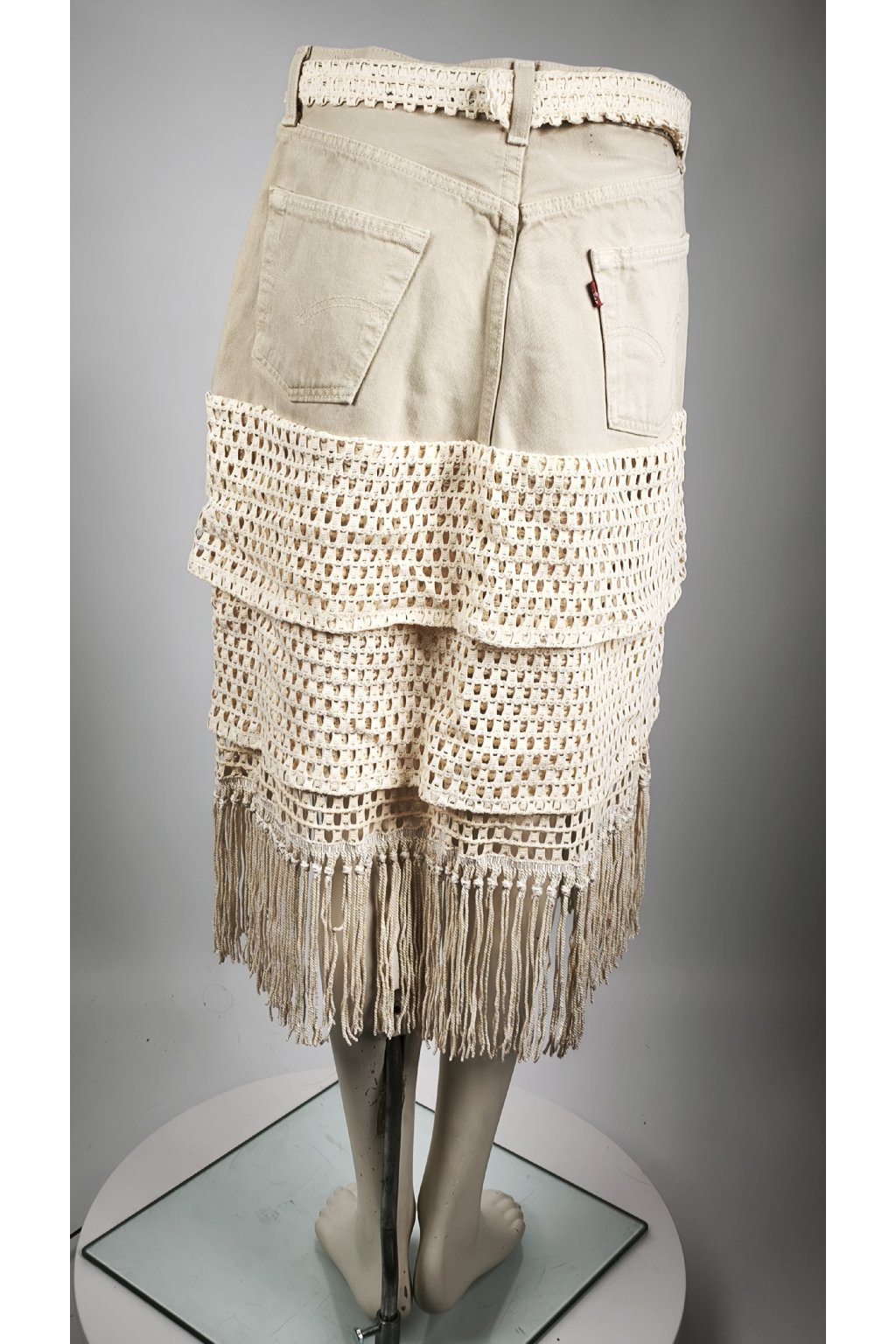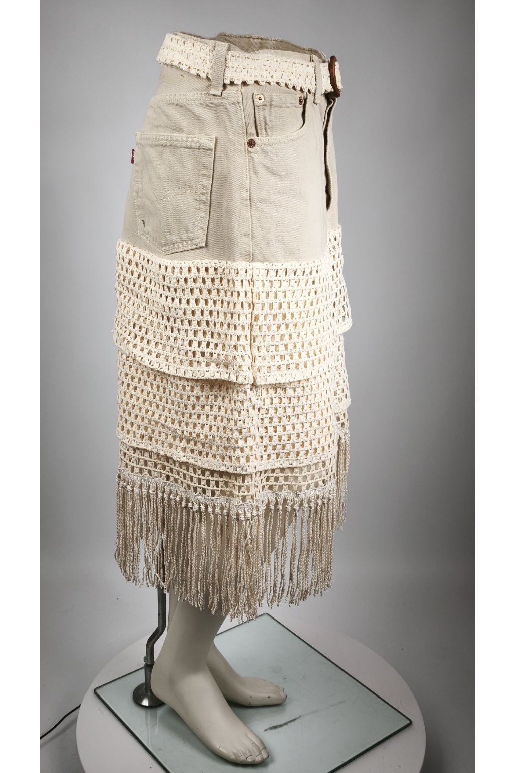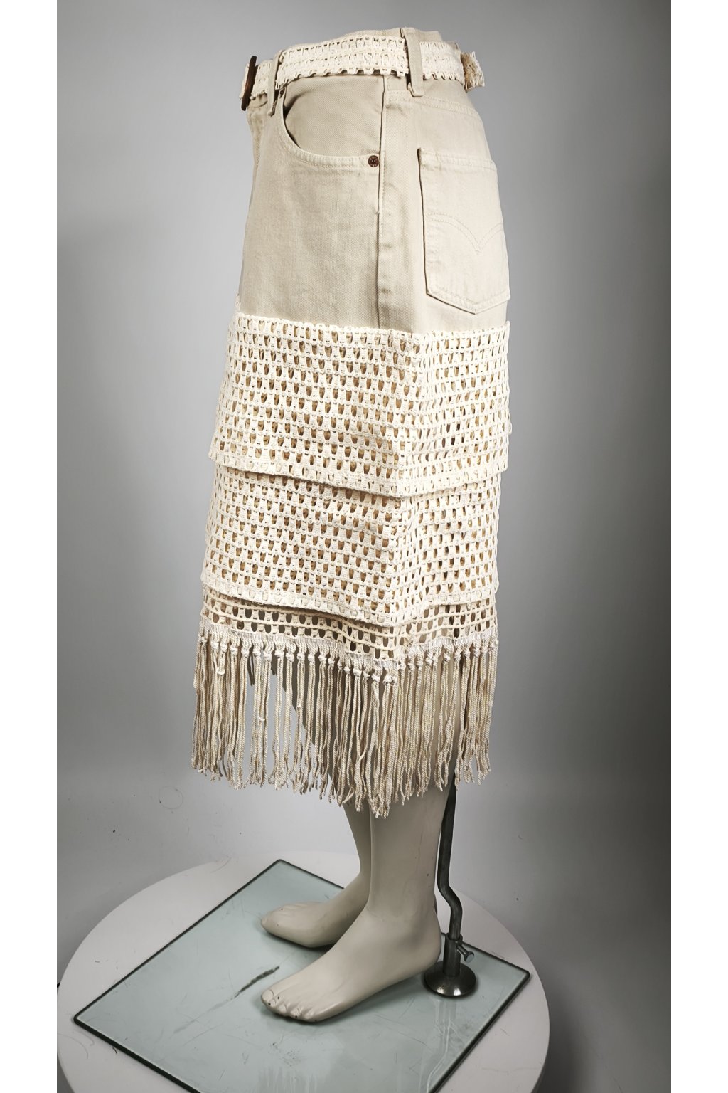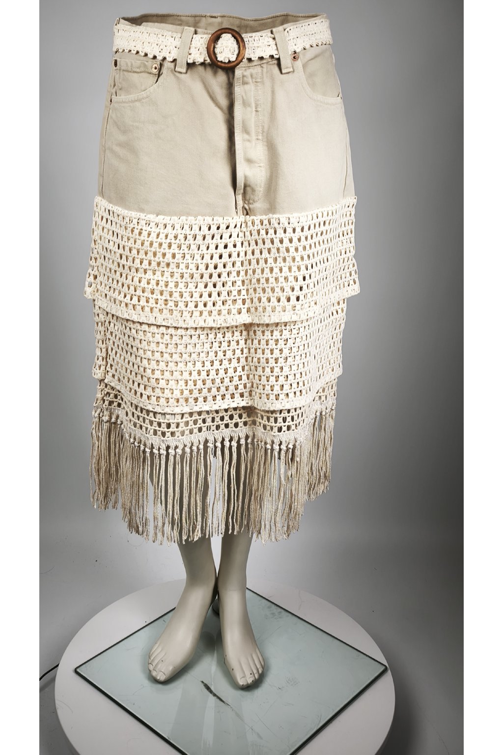 Upcycled Midi Sukňa "Boho Muse" (Beige Denim & Fringe)