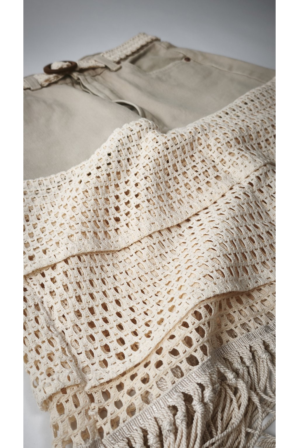 - Zloženie: Upcyklovaný vintage denim (bavlna) + secondhand čipkovaná/macramé textília so strapcami.