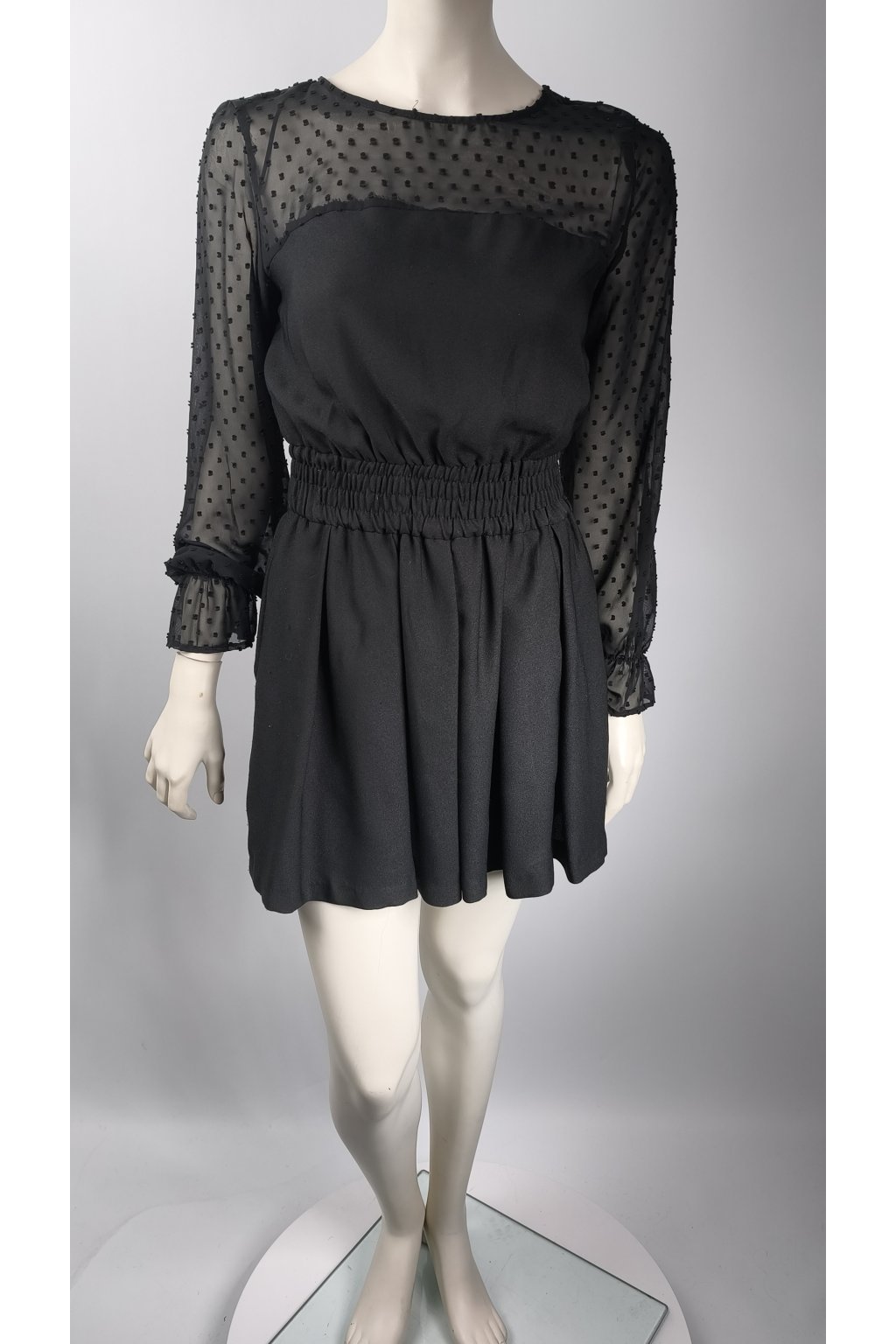 Tento čierny overal od ZARA je elegantným kúskom s jemnými detailami. Priehľadné bodkované rukávy pridávajú sofistikovaný nádych, zatiaľ čo elastický pás zabezpečuje pohodlné nosenie. Ideálny na večerné výlety alebo špeciálne príležitosti.