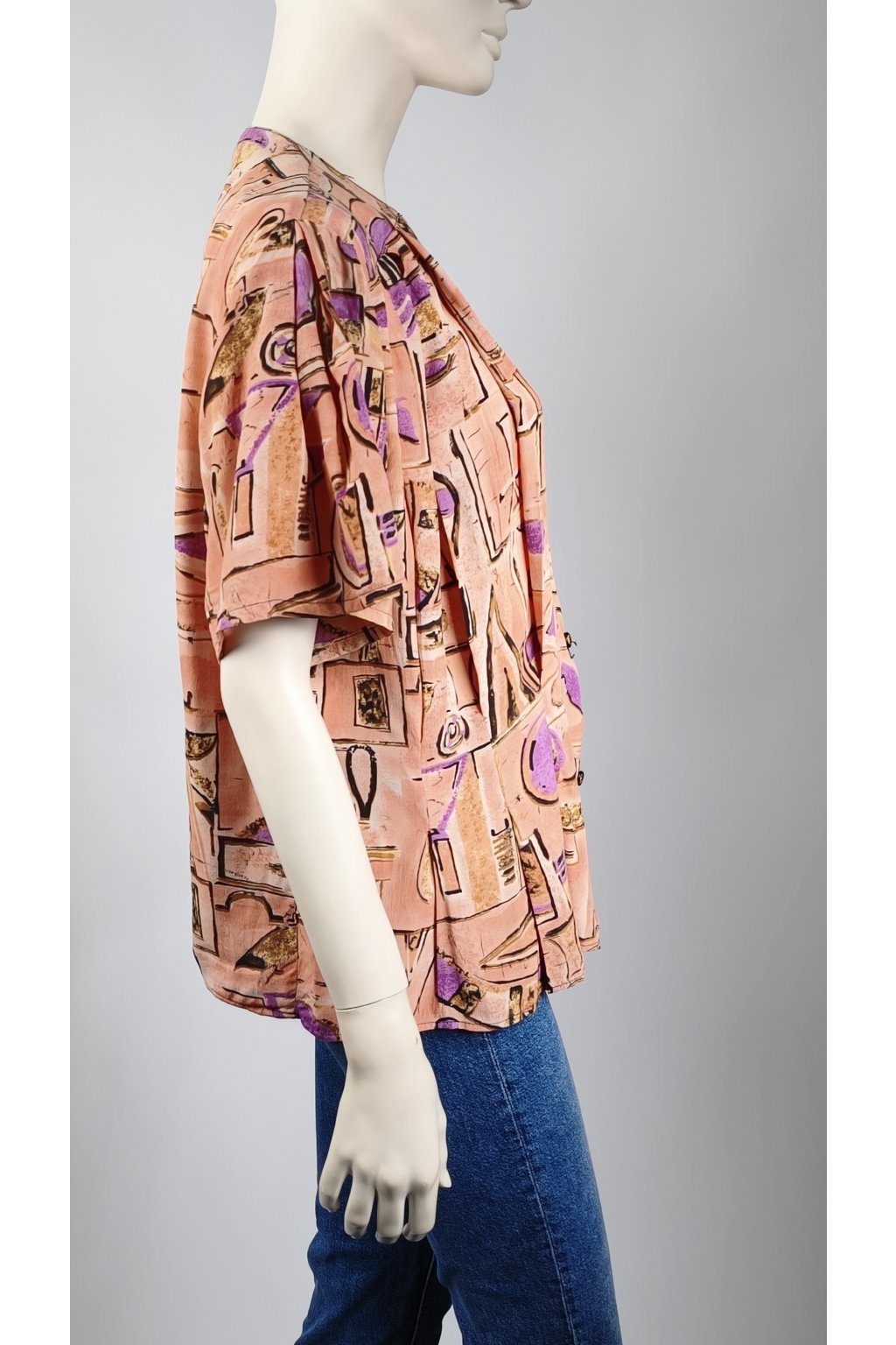 Táto dámska blúzka zaujme svojim abstraktným vzorom v kombinácii pastelových odtieňov ružovej a fialovej, ktoré vytvárajú jedinečný vizuálny efekt. Je vyrobená z materiálu, ktorý pripomína na dotyk jemnú viskózu, čo zaručuje príjemný pocit pri nosení.