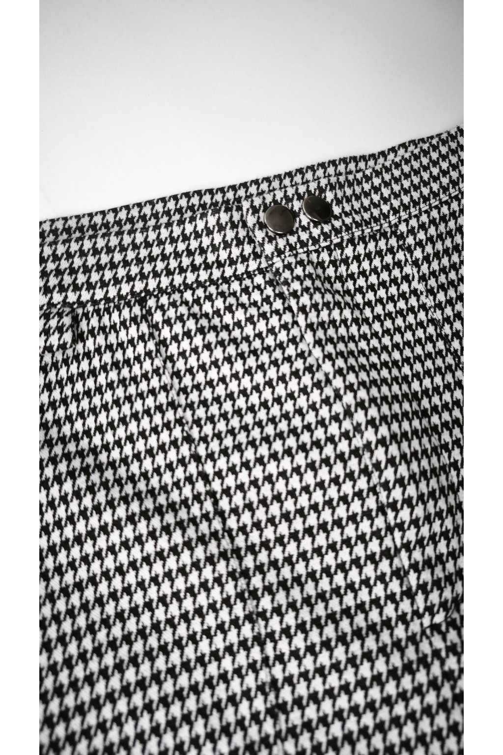 Táto elegantná sukňa vyniká čierno-bielym vzorom kohútia stopa, ktorý prináša nadčasovosť a sofistikovanosť. Sukňa má rovný strih a zapínanie na gombík, čo jej dodáva klasický vzhľad.