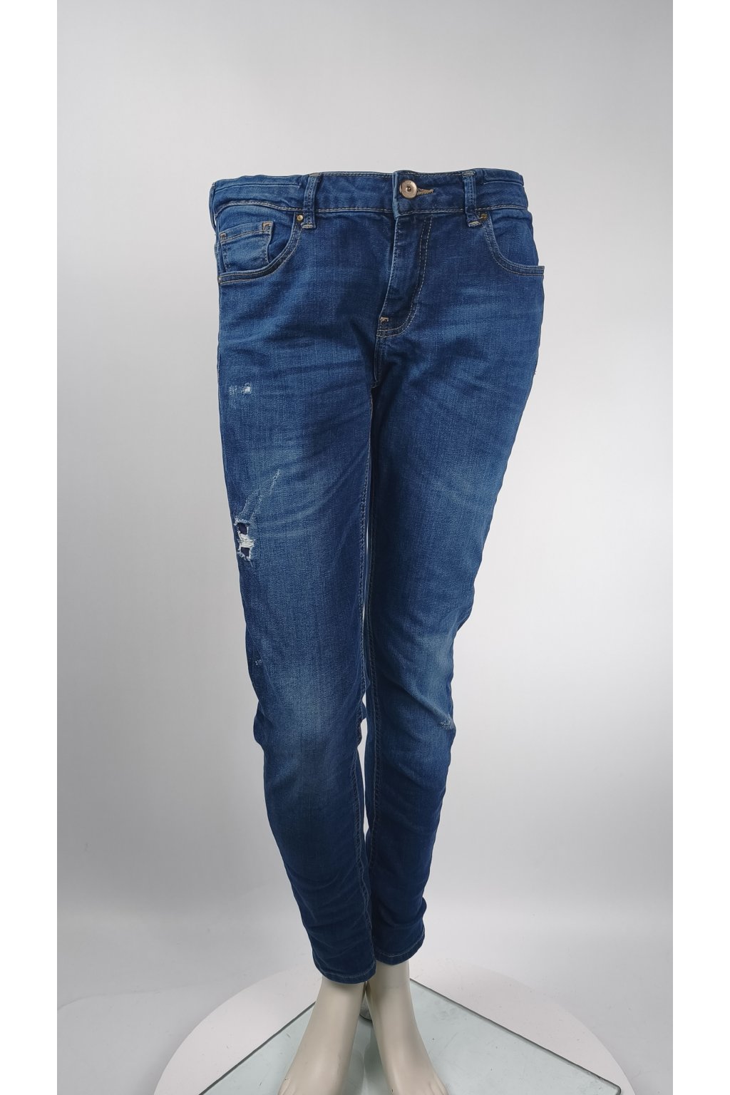 Elegantné modré džínsy značky ZARA ponúkajú moderný vzhľad s jemnými opotrebovanými detailmi, ktoré dodávajú charakter. Strih je pohodlný a vhodný pre každodenné nosenie.