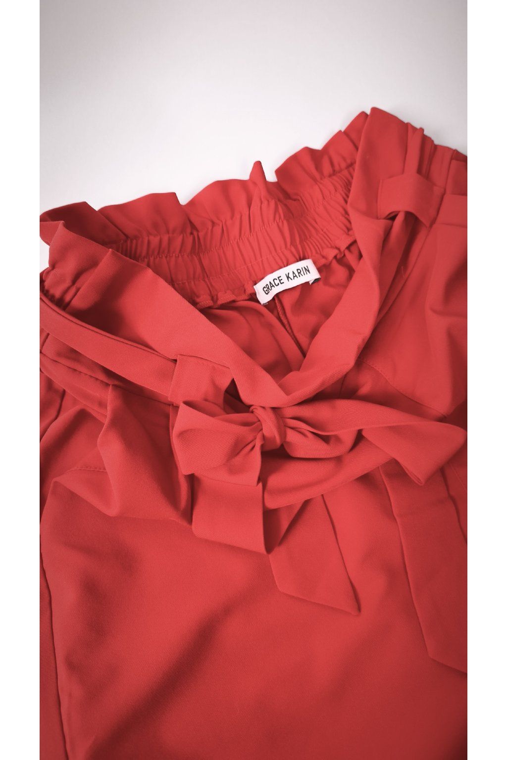 Elegantné červené nohavice GRACE KARIN sú navrhnuté s dôrazom na štýl a komfort. Majú výrazný pás s ozdobným viazaním a spodný lem tiež zdobený mašľami, čo im dodáva jedinečný vzhľad.