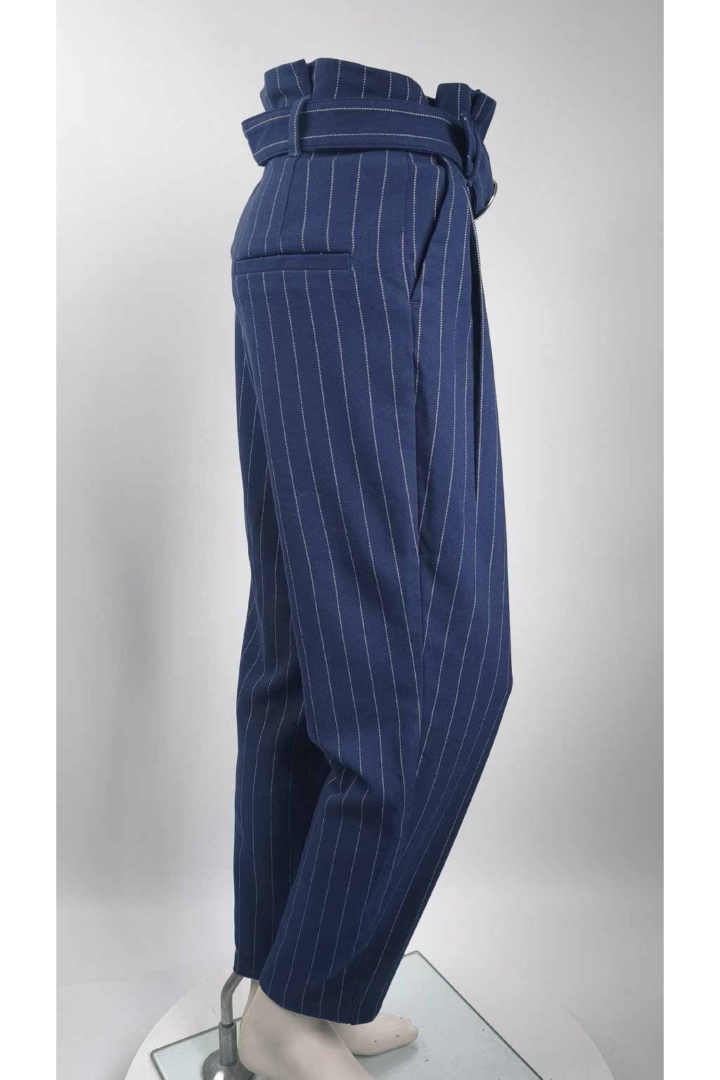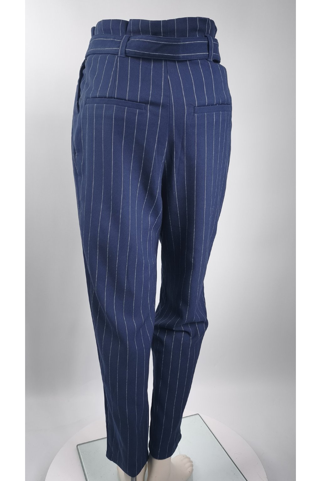 Elegantné modré nohavice s tenkými vertikálnymi pruhmi, ktoré opticky predlžujú postavu. Súčasťou je štýlový opasok s kruhovou prackou, ktorý dodáva nohaviciam moderný vzhľad.