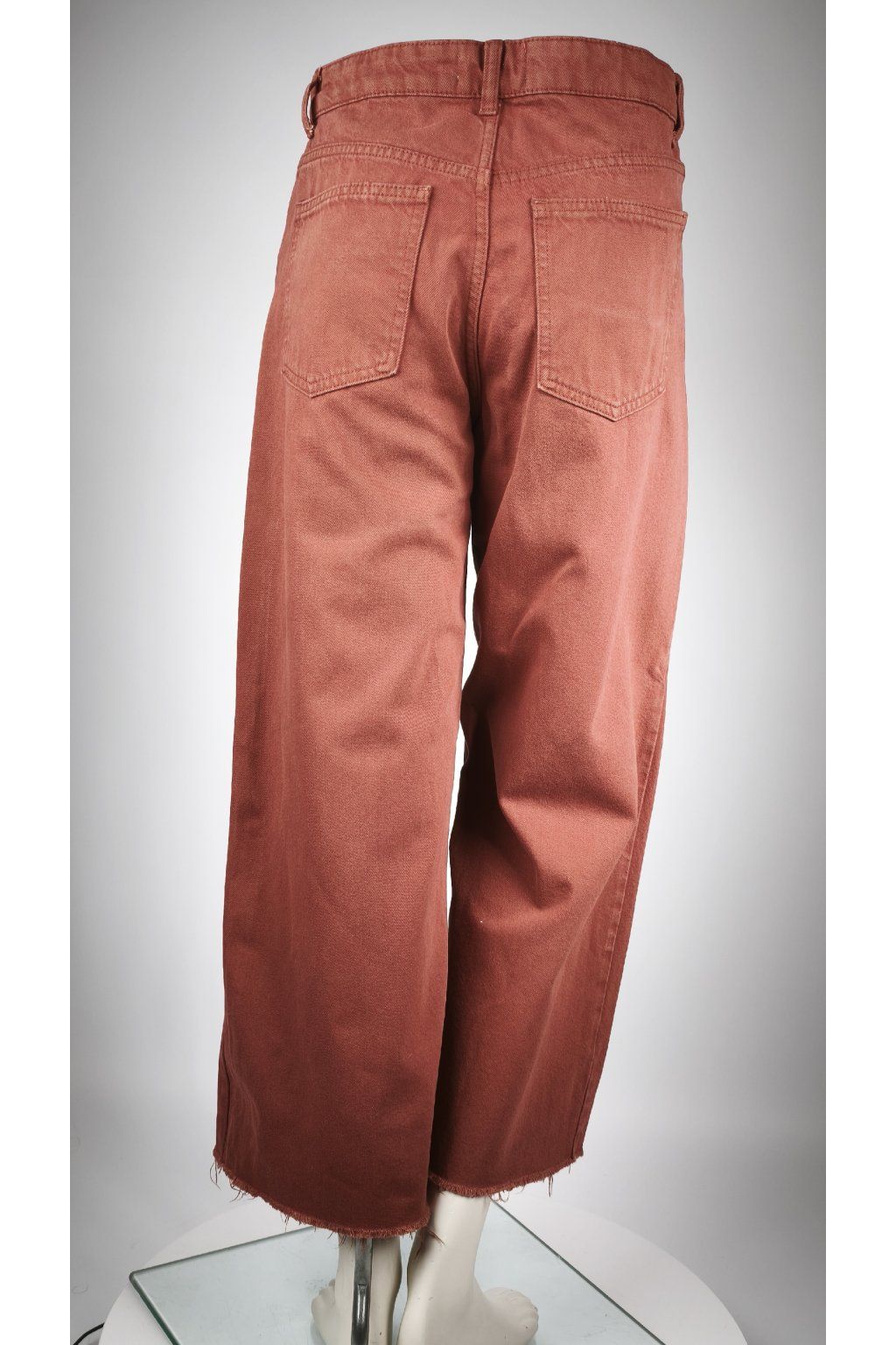 Tieto dámske nohavice ZARA v tehlovej červenej farbe prinášajú moderný voľný strih, ktorý je ideálny pre každodenné nosenie. Minimalistický dizajn dopĺňajú neopracované lemy, čo im dodáva ležérny vzhľad.