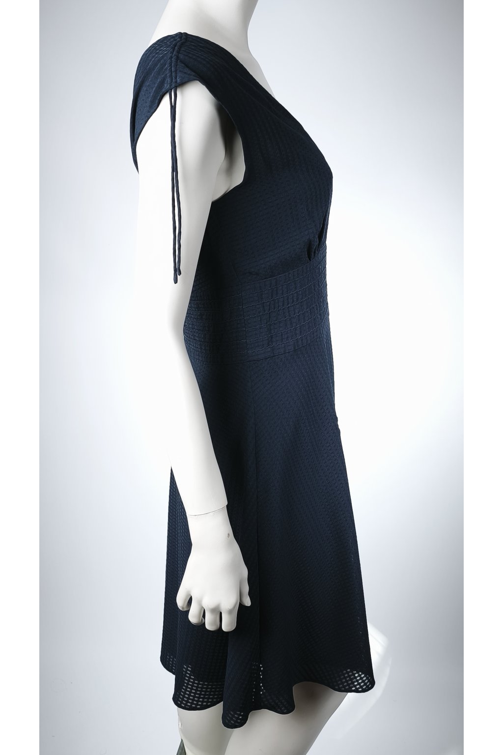 Tieto tmavomodré šaty ARMANI EXCHANGE sú stelesnením elegancie s jemným textúrovaným vzorom a rafinovaným strihom. Zaujímavý detail v podobe šnúrkových rukávov pridáva moderný vzhľad, ktorý je ideálny na rôzne príležitosti.