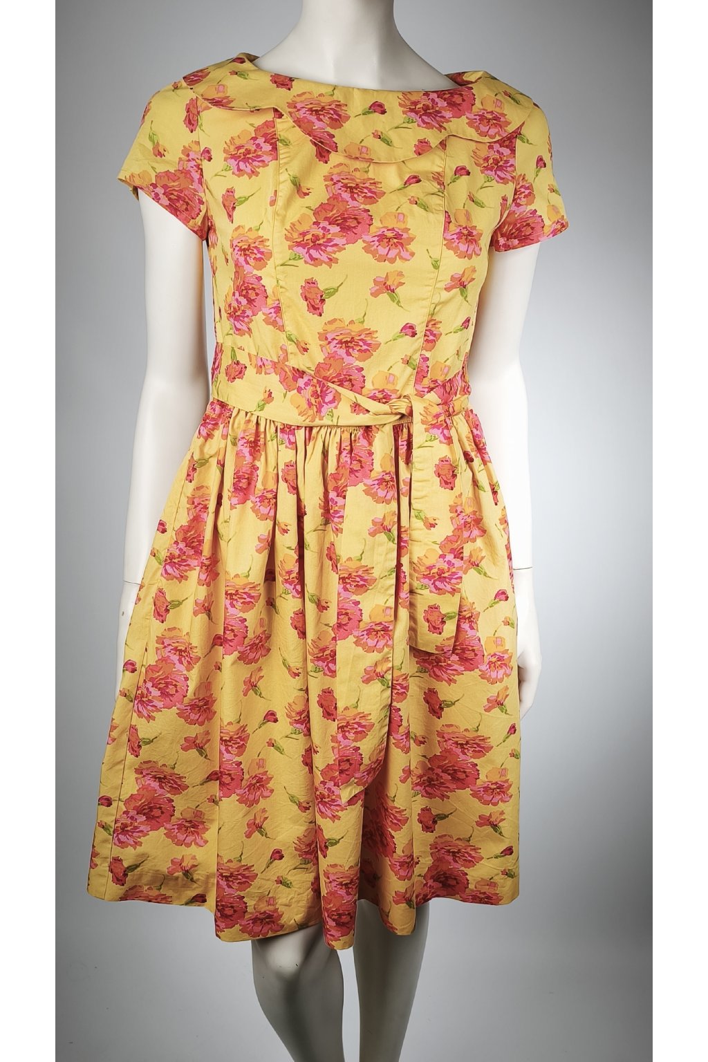 Tieto nádherné žlté šaty s kvetinovým vzorom od značky Cacharel sú dokonalou voľbou pre milovníčky vintage štýlu. Šaty majú jemne priliehavý strih s krátkymi rukávmi a elegantným golierikom, ktorý dodáva šatám retro šarm.