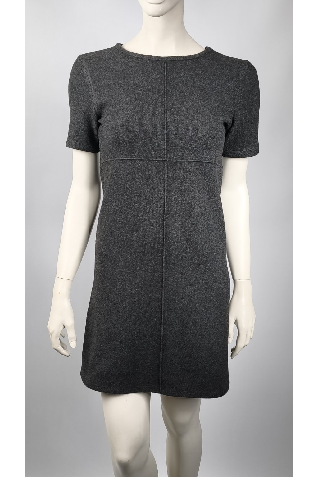 Tieto tmavosivé šaty značky ZARA ponúkajú jednoduchý a elegantný dizajn s krátkymi rukávmi a jemným švom cez stred. Ich minimalistický štýl je ideálny pre každodenné nosenie aj špeciálne príležitosti.