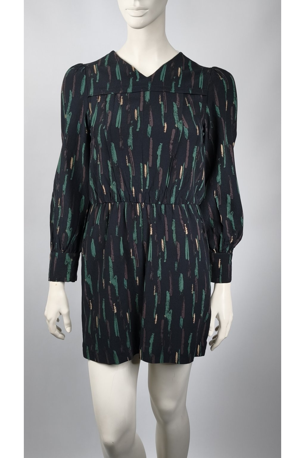 Tieto ZARA šaty sa vyznačujú elegantným dizajnom s abstraktným vzorom v zelených a hnedých tónoch na tmavom podklade. Dlhé rukávy a jemná textúra materiálu pridávajú na sofistikovanosti. Na pravom ramene je malá dierka, ktorá bola zašitá, čo je zohľadnené v cene.
