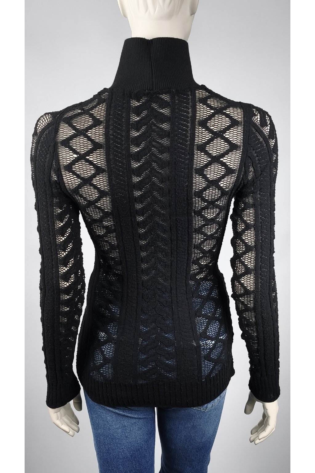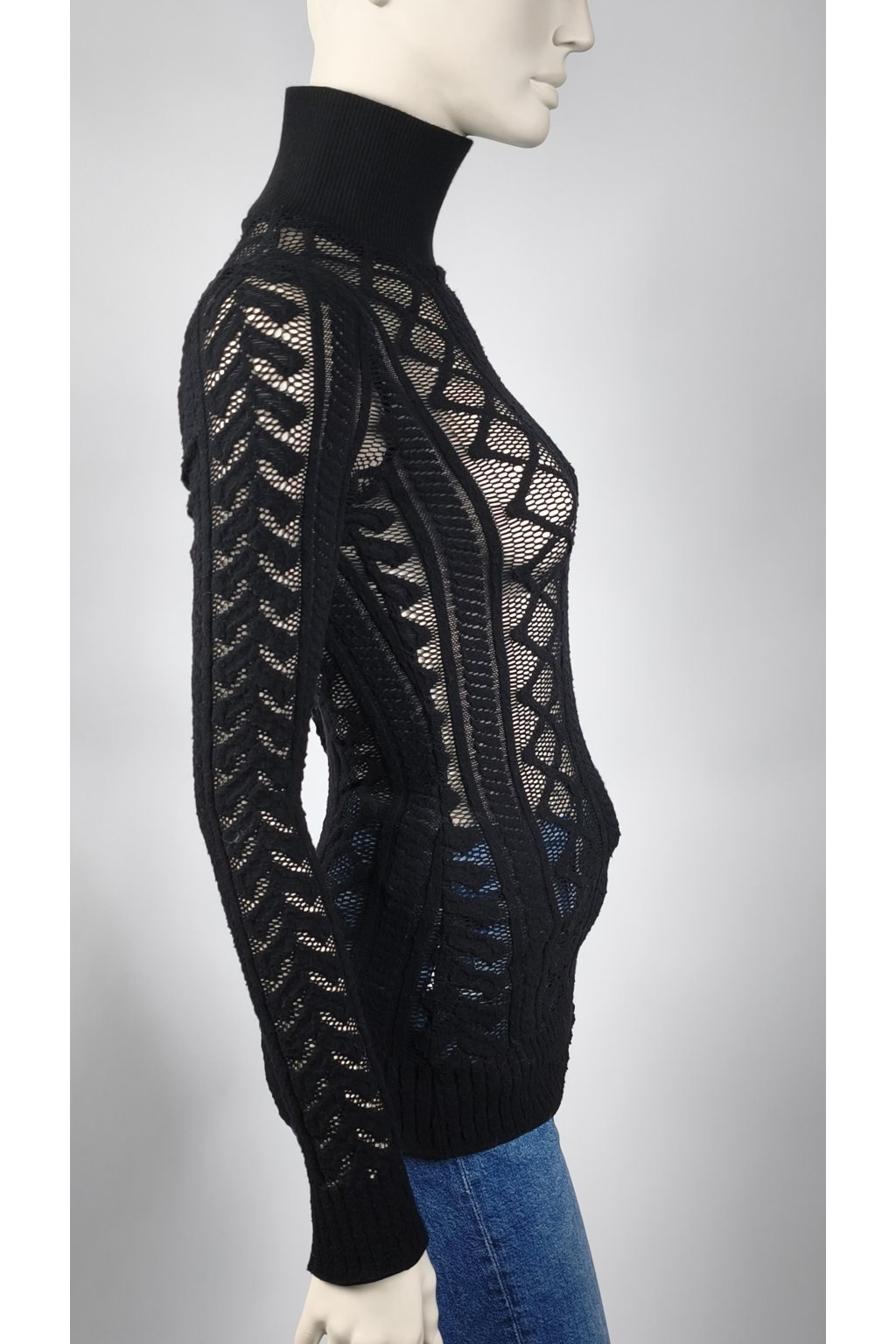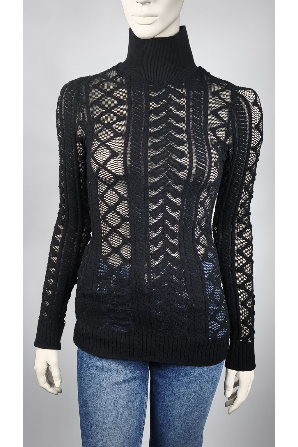 Čierny sveter s transparentným vzorom a vysokým golierom je skvelou voľbou pre štýlové vrstvenie. Jemná textúra a detailné vzory dodávajú tomuto kúsku elegantný vzhľad, ktorý sa hodí na každú príležitosť.