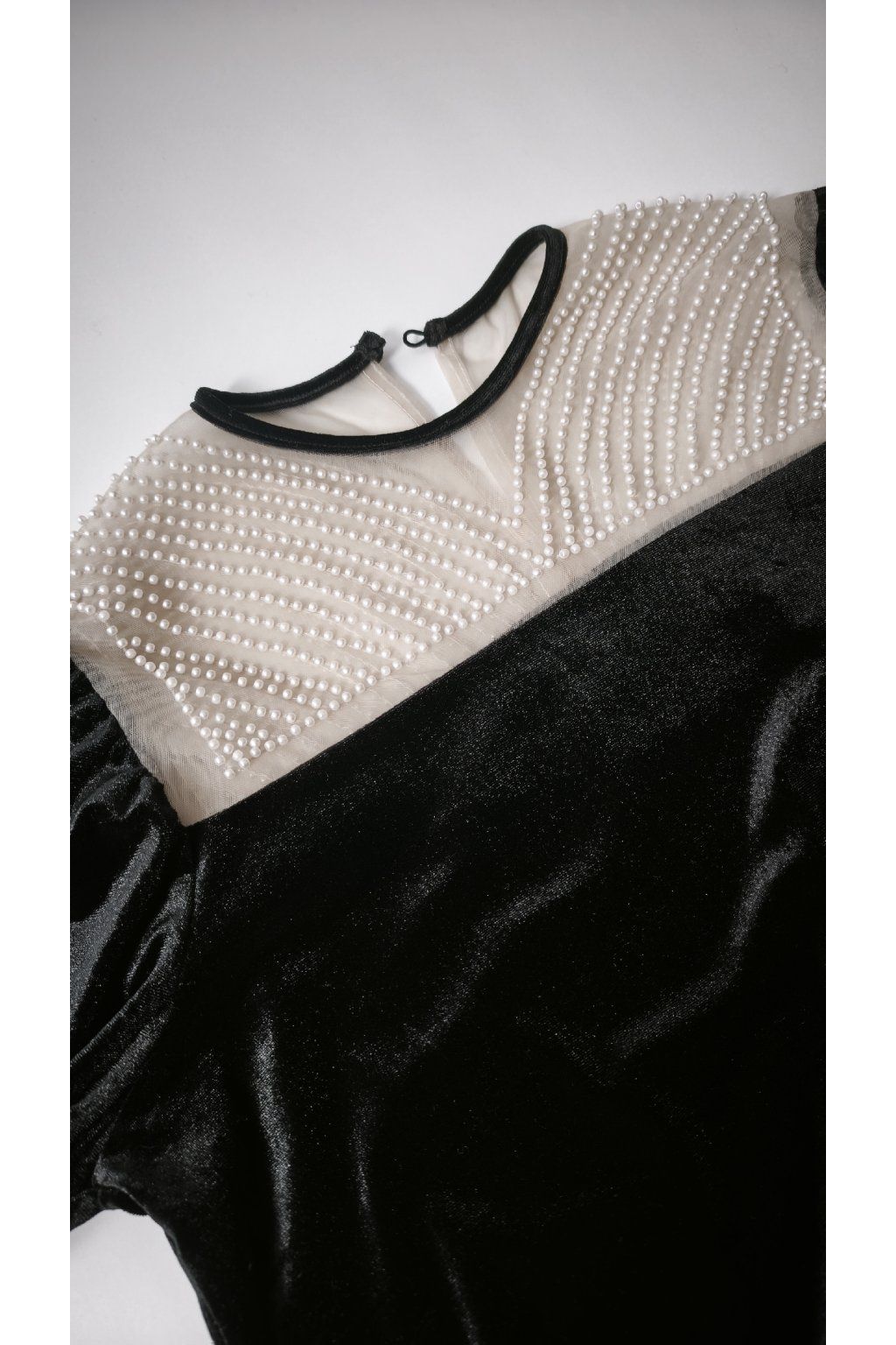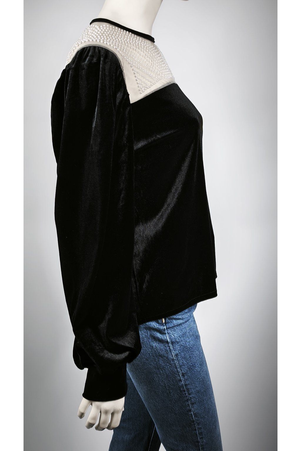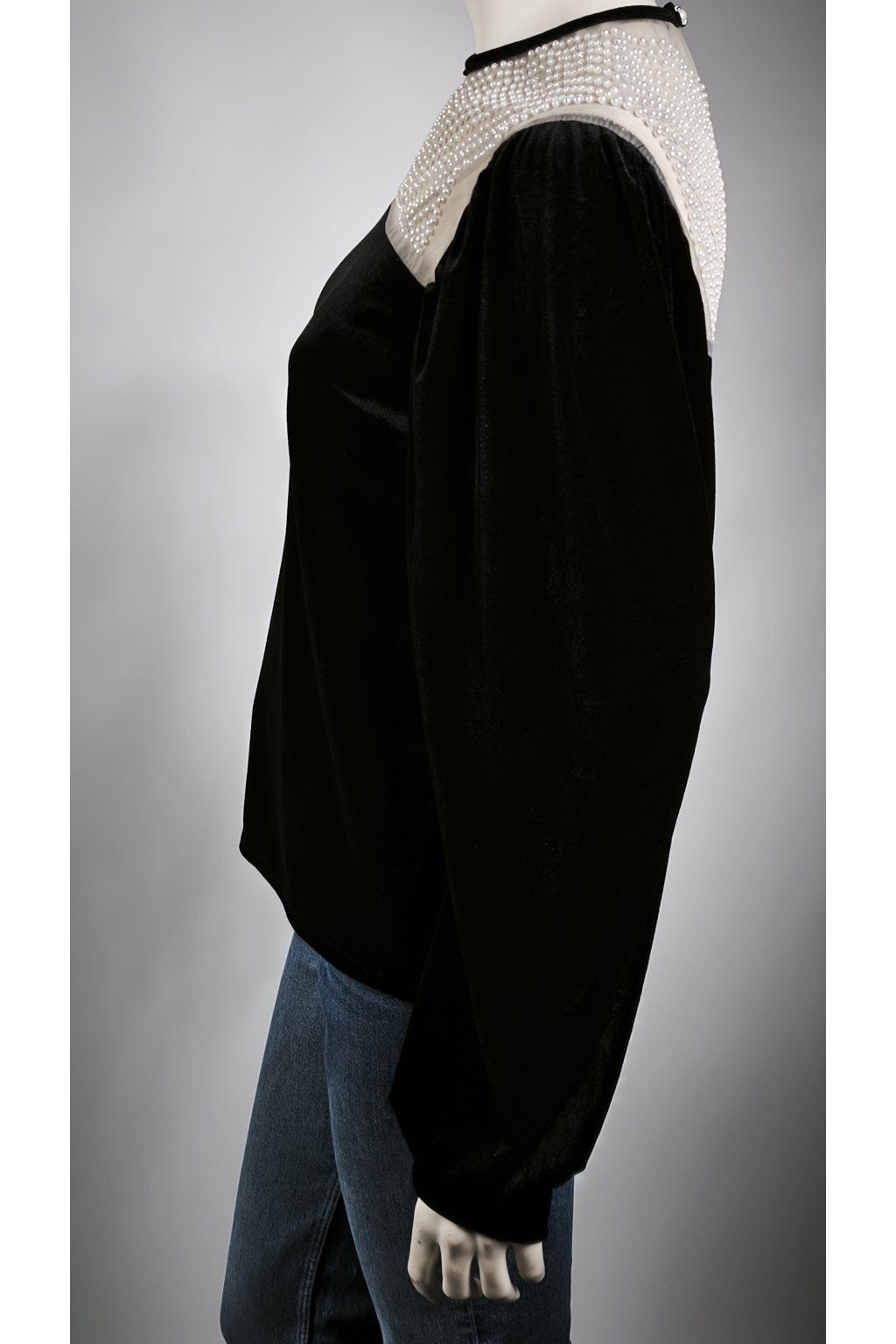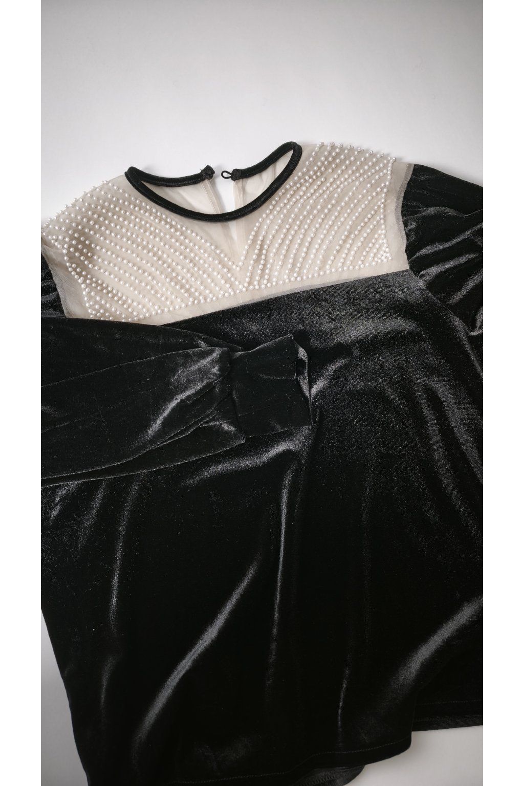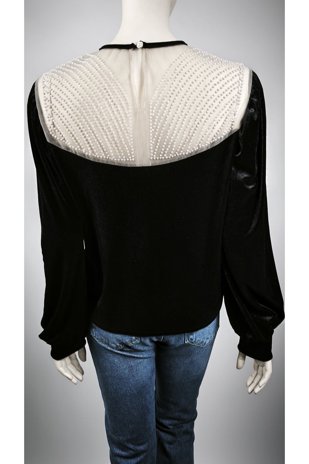 Elegantný čierny sveter s jemnými perličkami a zamatovým vzhľadom.