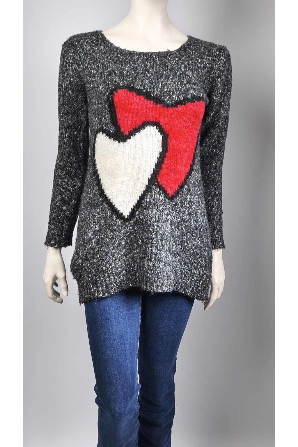 Štýlový sivý svetrový pulóver s výrazným srdcovým vzorom od značky QUIZ. Ideálny na zimné dni.