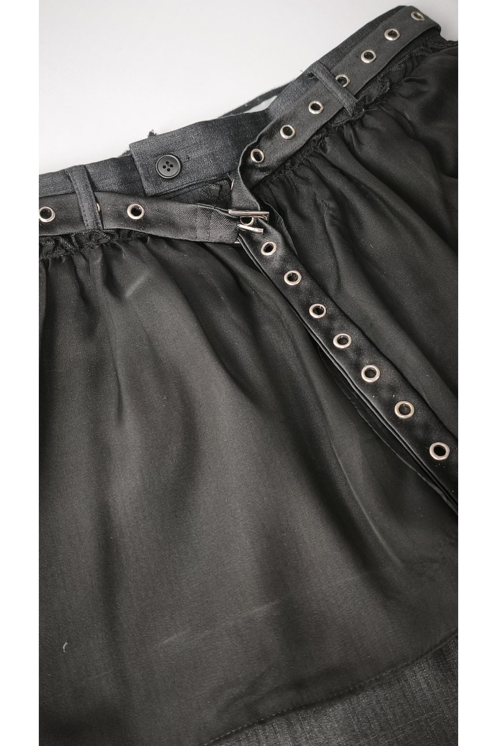 - Pôvodný materiál: Pánske oblekové nohavice + deadstock/secondhand transparentná látka