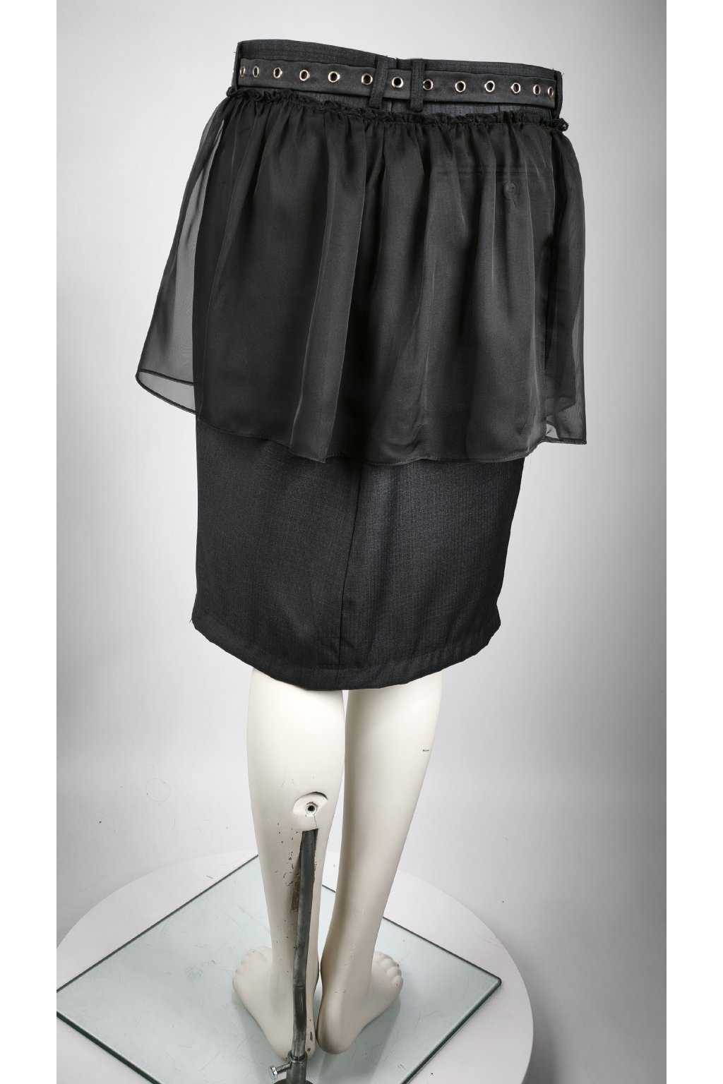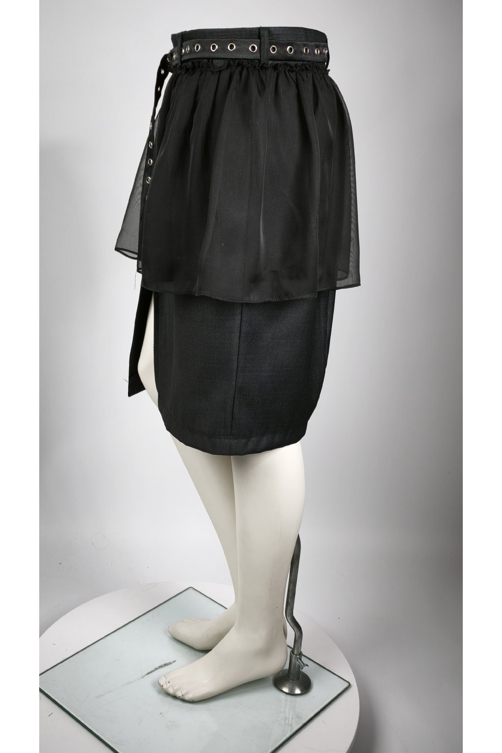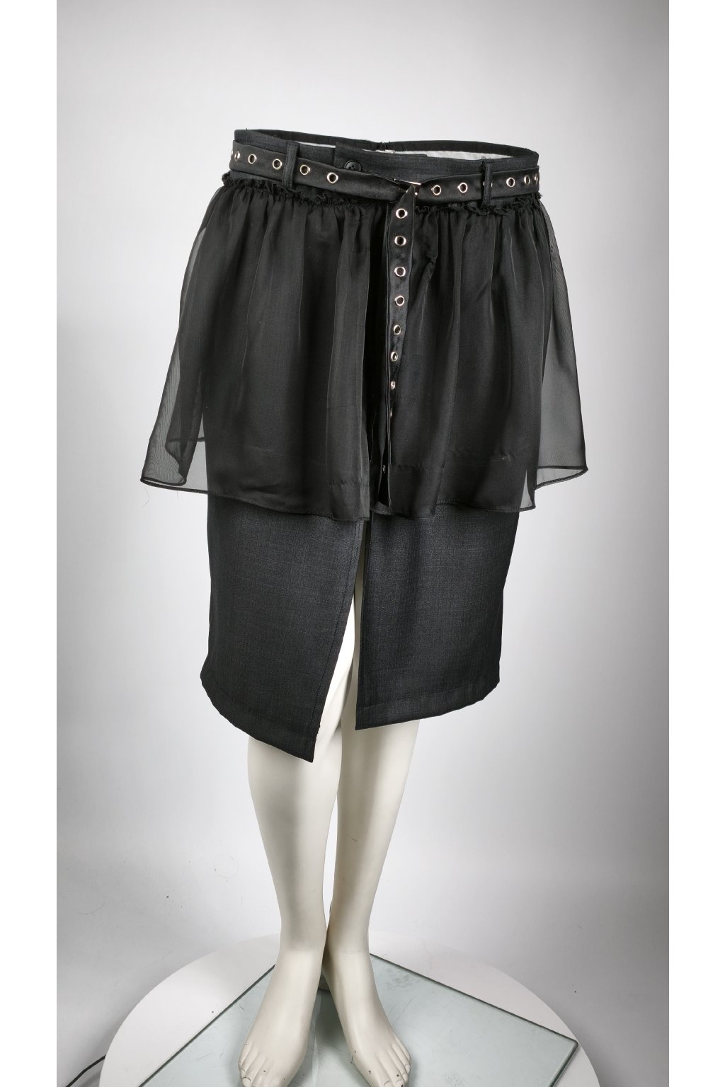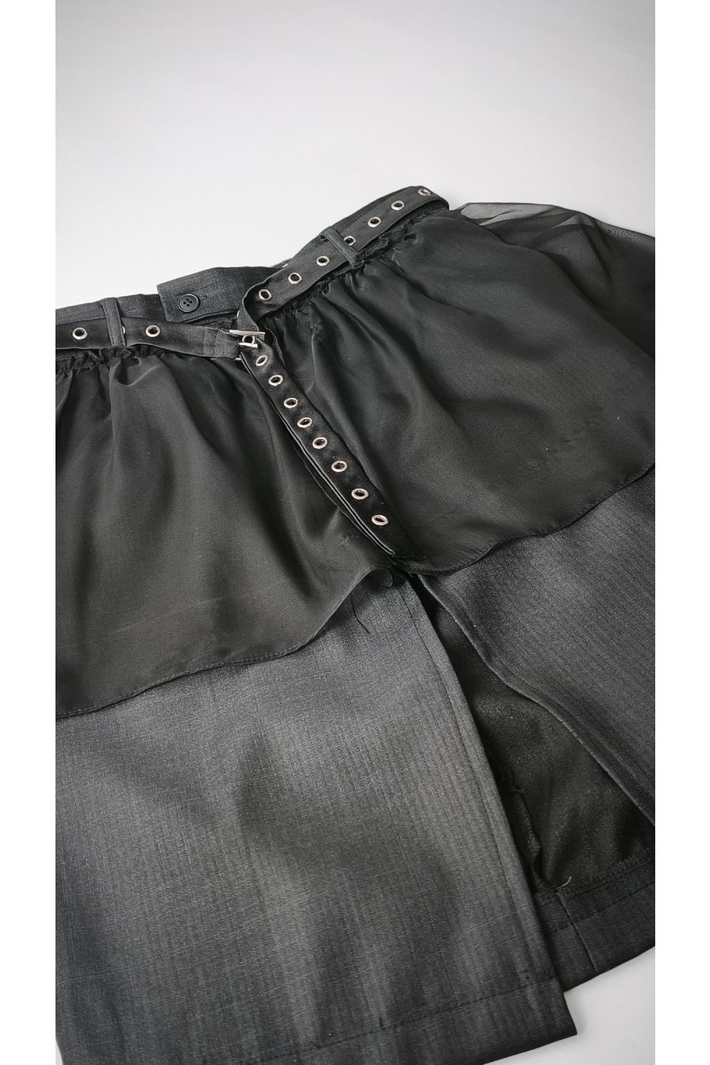 Tento kúsok s príbehom vznikol mimoriadne precíznou dekonštrukciou prémiových oblekových nohavíc. Aby sme úplne rozbili formálnosť základu, doplnili sme ho o dramatickú, nariasenú vrstvu transparentného materiálu a drsnejší opasok s kovovými očkami. Výsledok? Avantgardný vibe s nádychom dekonštruovaného grunge štýlu. Je to presne ten kúsok, v ktorom sa budeš cítiť maximálne sebavedomo, či už si ho oblečieš k basic bielemu tričku a teniskám, alebo k chunky svetru a robustným boots. Smart voľba pre ženu, ktorá si potrpí na dizajn a nechce splývať s davom.