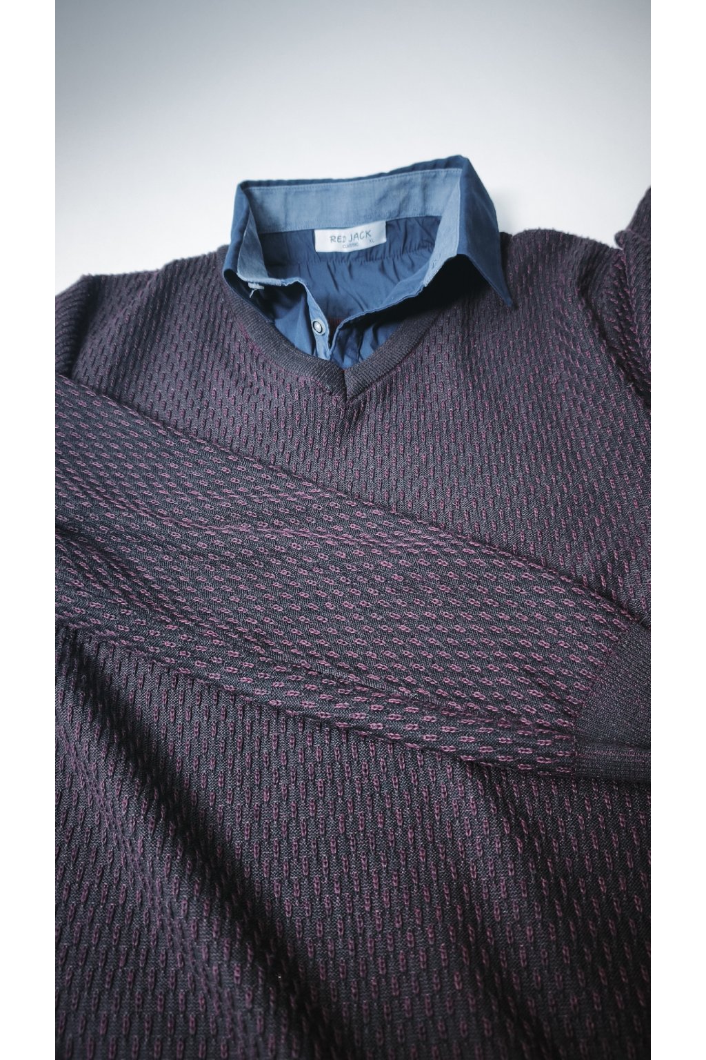 Tento pánsky sveter vyniká svojou hlbokou vínovou farbou a jemným vzorovaním, ktoré pridáva textúru a štýl. V-výstrih je ideálny pre vrstvenie s košeľou, čím vytvára sofistikovaný vzhľad.
