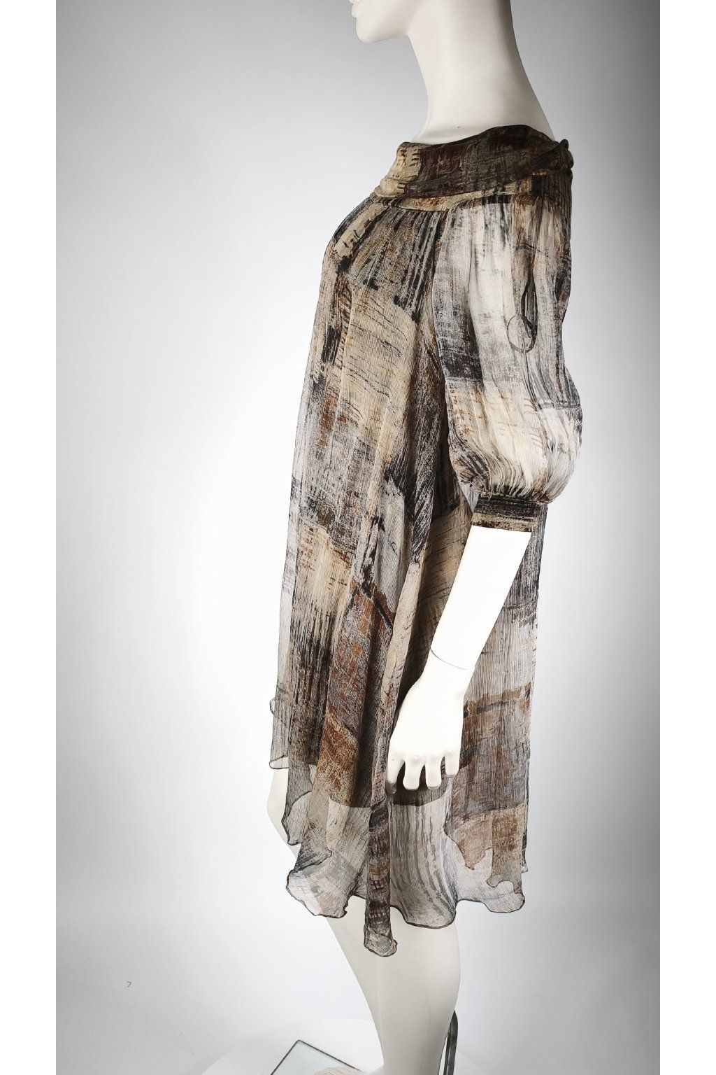 Elegantné šaty s umeleckým vzorom v zemitých tónoch, ideálne pre štýlové príležitosti.