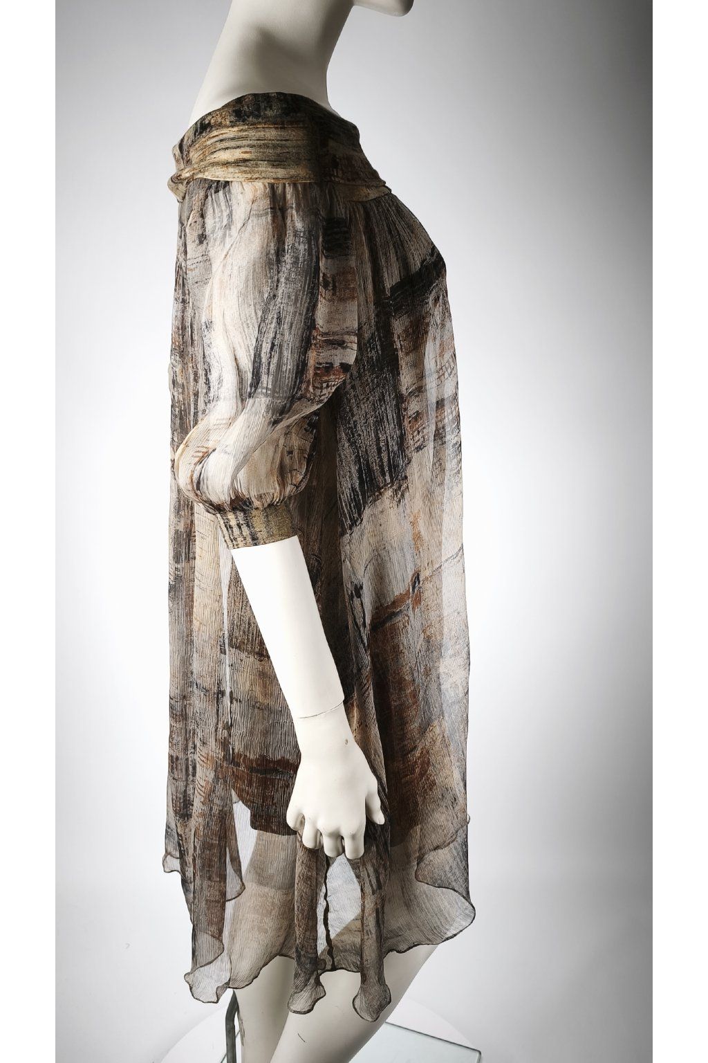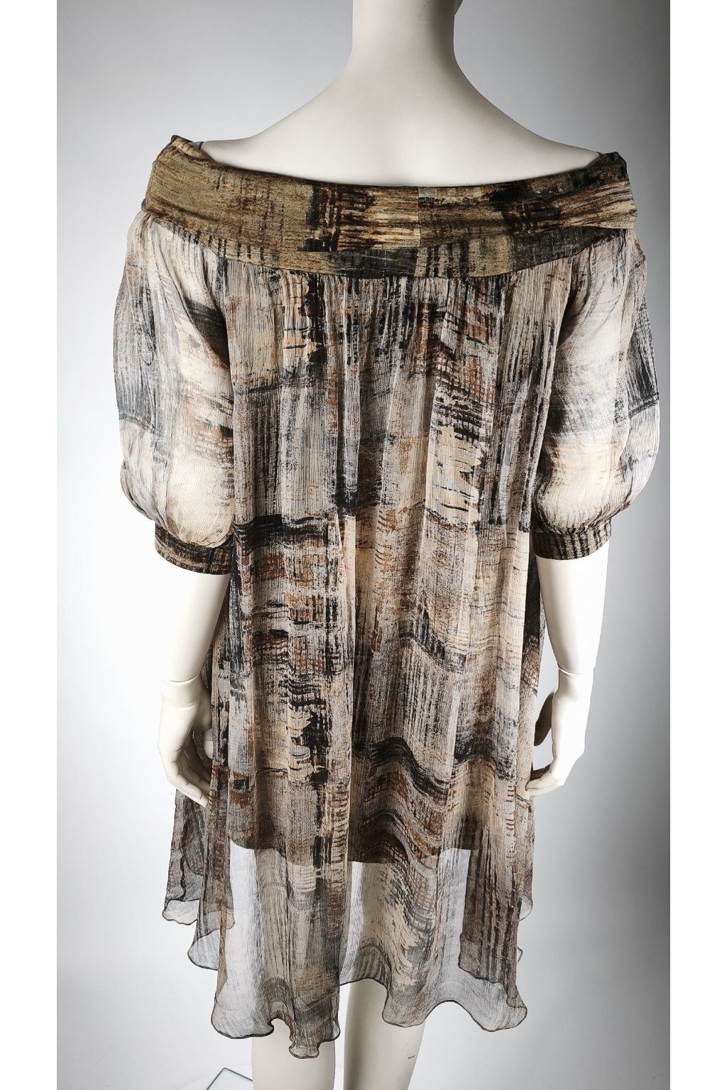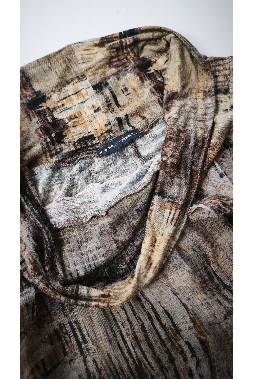 Elegantné šaty od AGNES TOMA zaujmú svojím umeleckým vzorom v zemitých tónoch, ktorý dodáva jedinečný vzhľad. Ľahký materiál s jemným leskom a voľným strihom zaručuje pohodlie a štýlovú eleganciu.