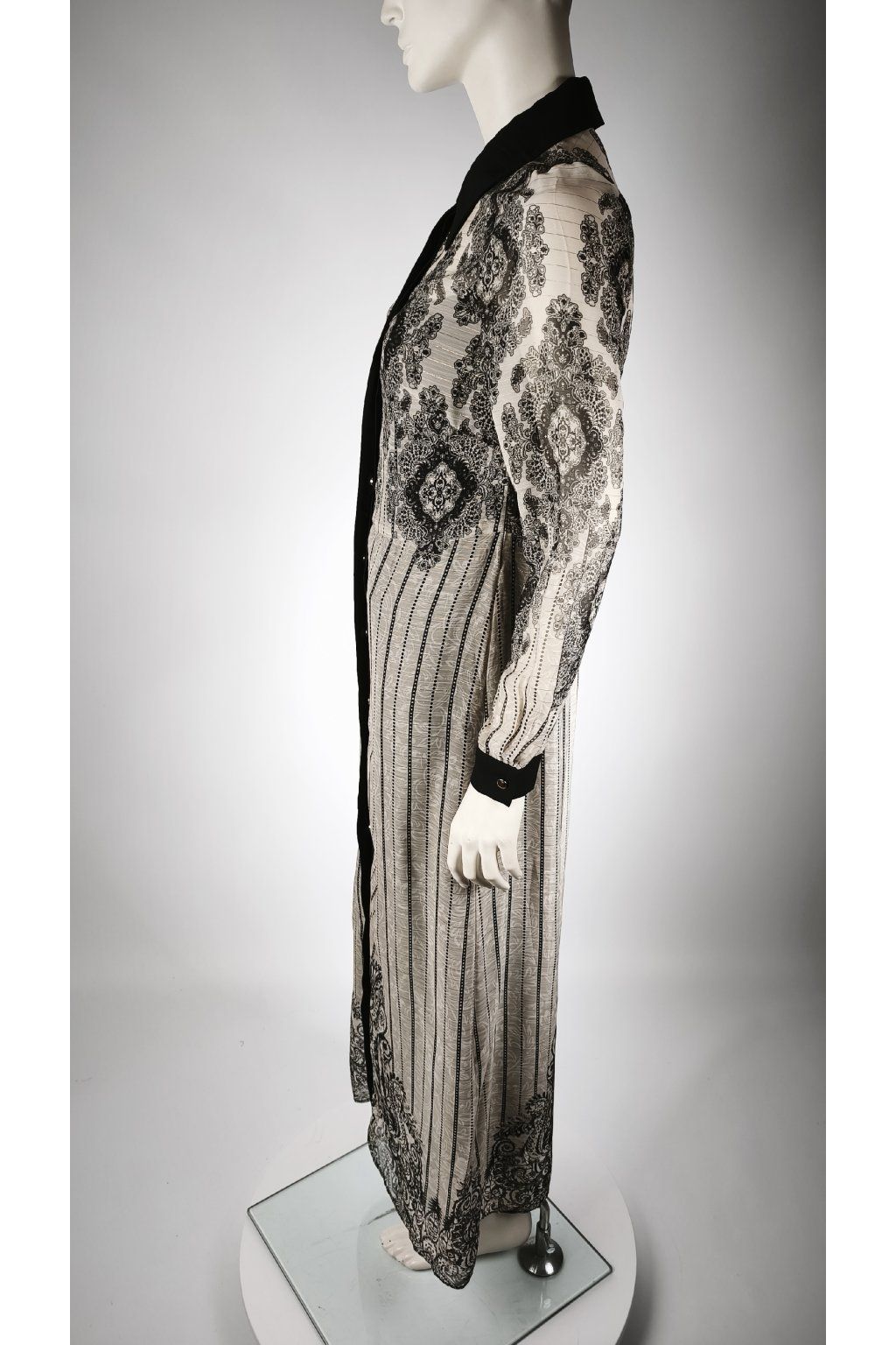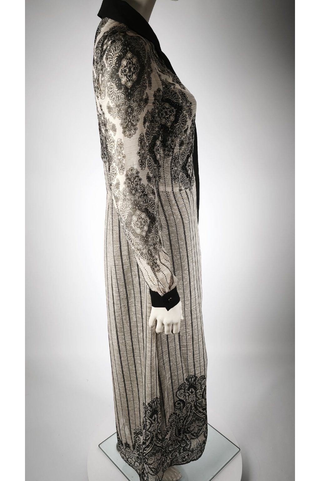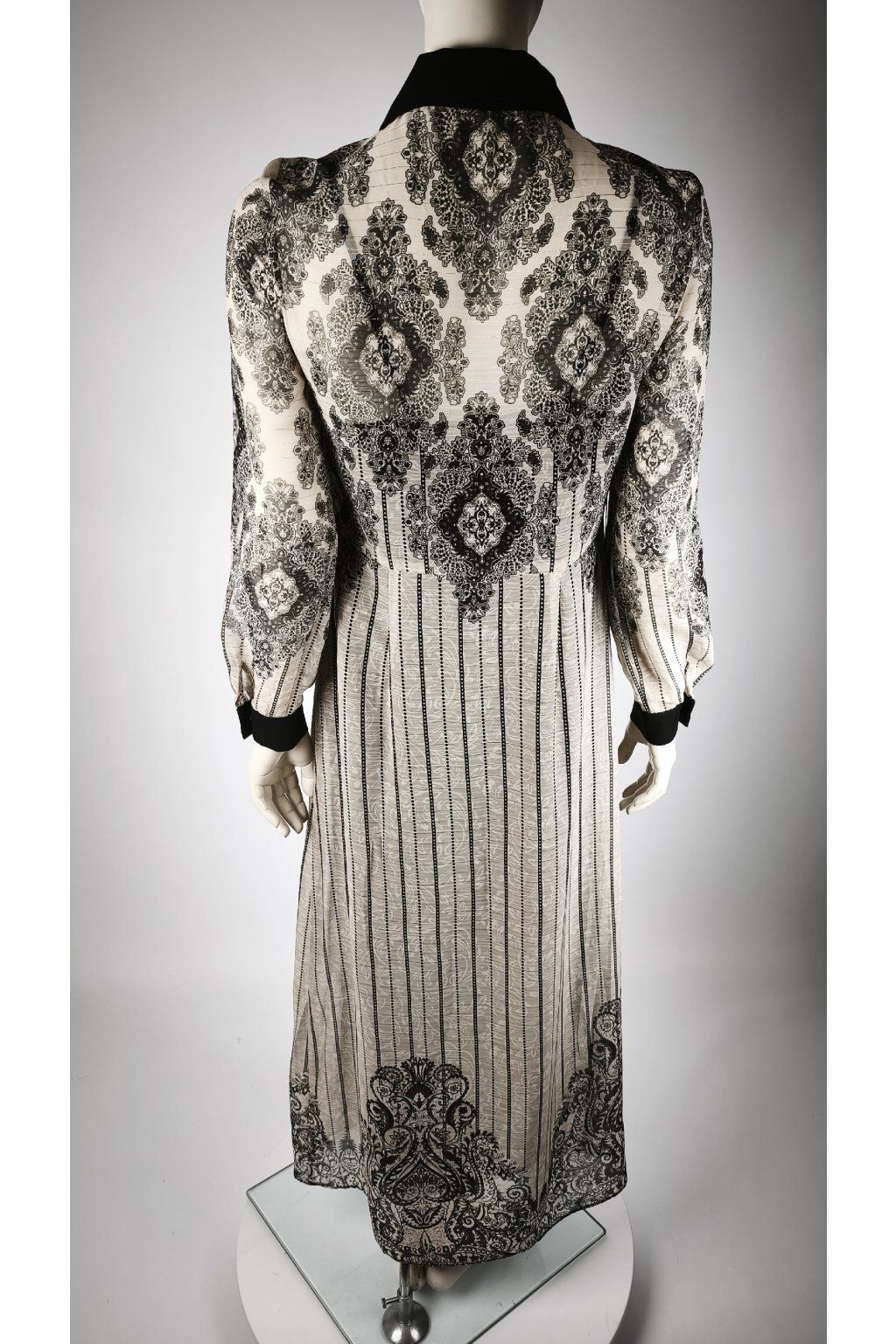 Elegantné čierno-biele šaty s jemnými vzormi.