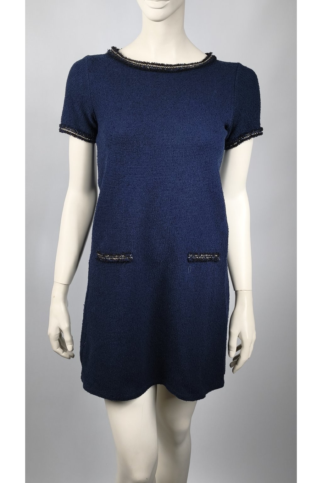 Tieto modré šaty od značky CACHE CACHE sú dokonalým spojením elegancie a pohodlia. Jednoduchý strih je zvýraznený jemným bordúrovým detailom na rukávoch a výstrihu, čo dodáva šatám sofistikovaný vzhľad.