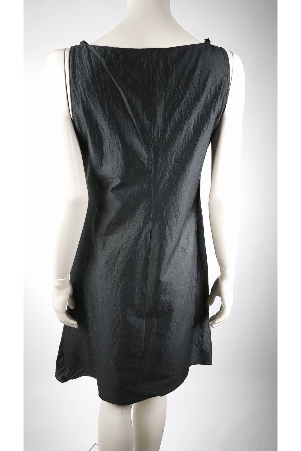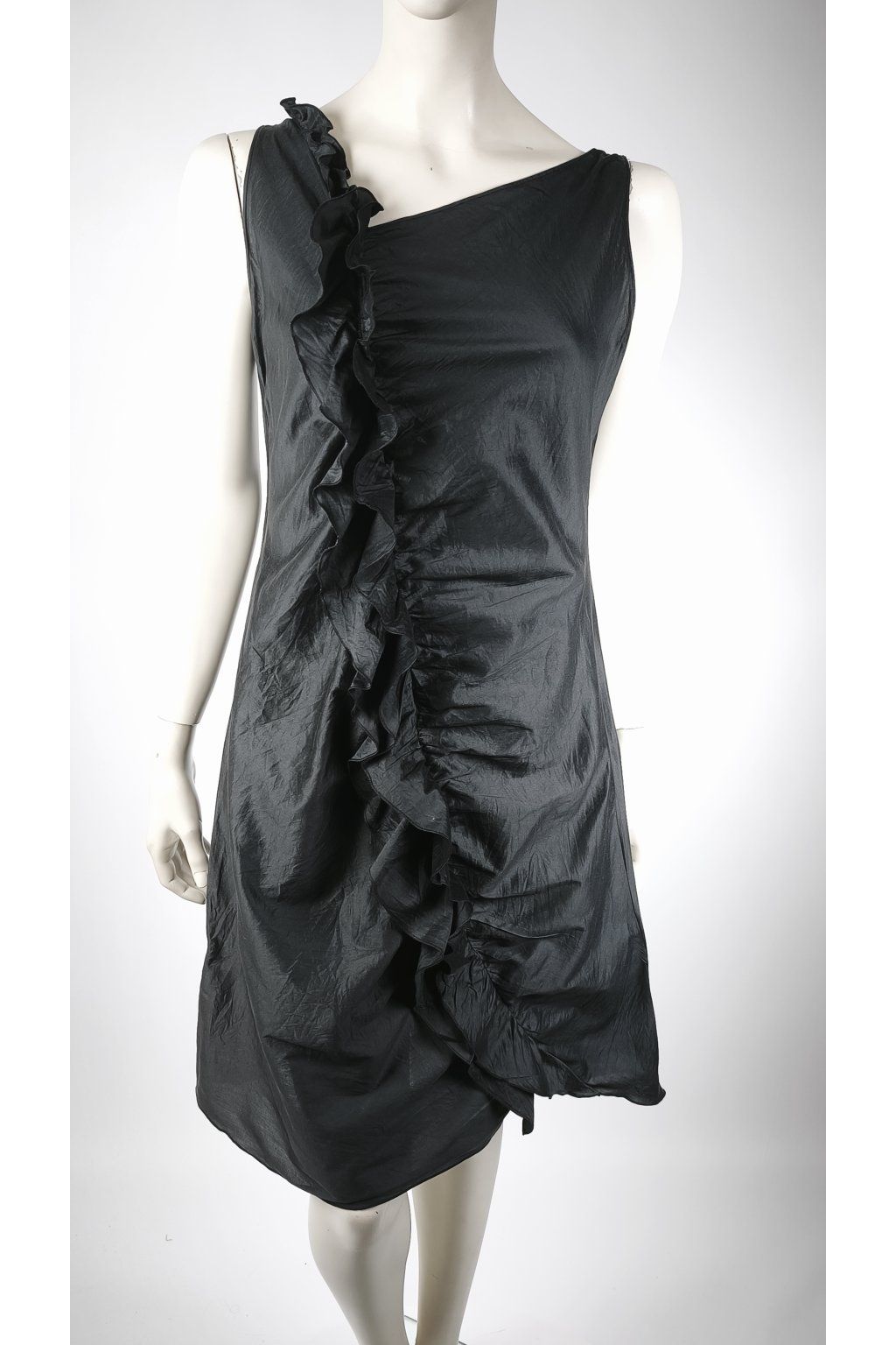 Elegantné čierne šaty HUGO BOSS s asymetrickým volánovým detailom.
