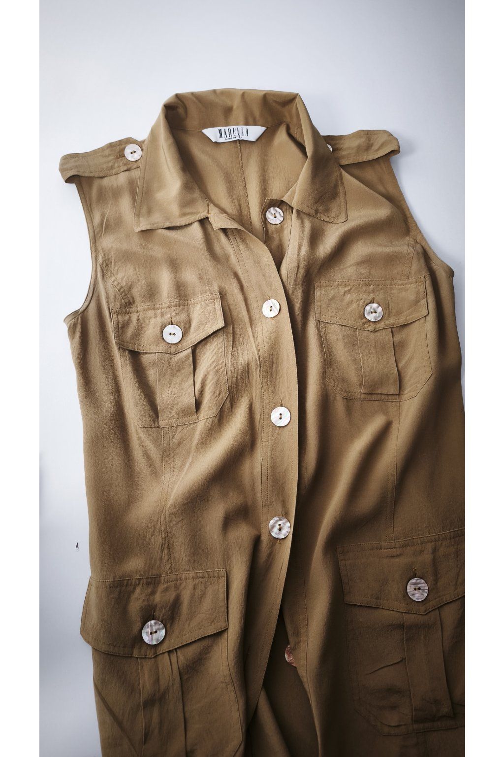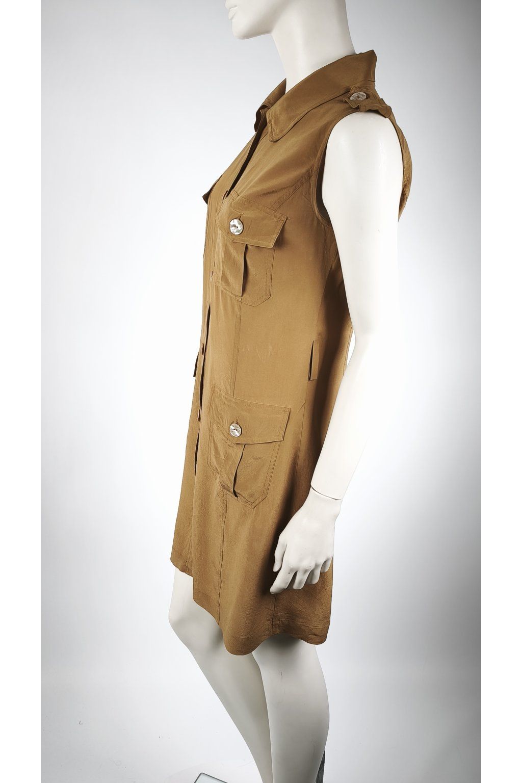 Tieto elegantné šaty MARELLA v hnedej farbe sú dokonalým príkladom vintage módy, ktorá nikdy nevyjde z módy. Ich jednoduchý, ale sofistikovaný strih s výraznými gombíkmi dodáva šatám nádych retro šarmu. [Vada: chýba opasok, čo je zohľadnené v cene.]