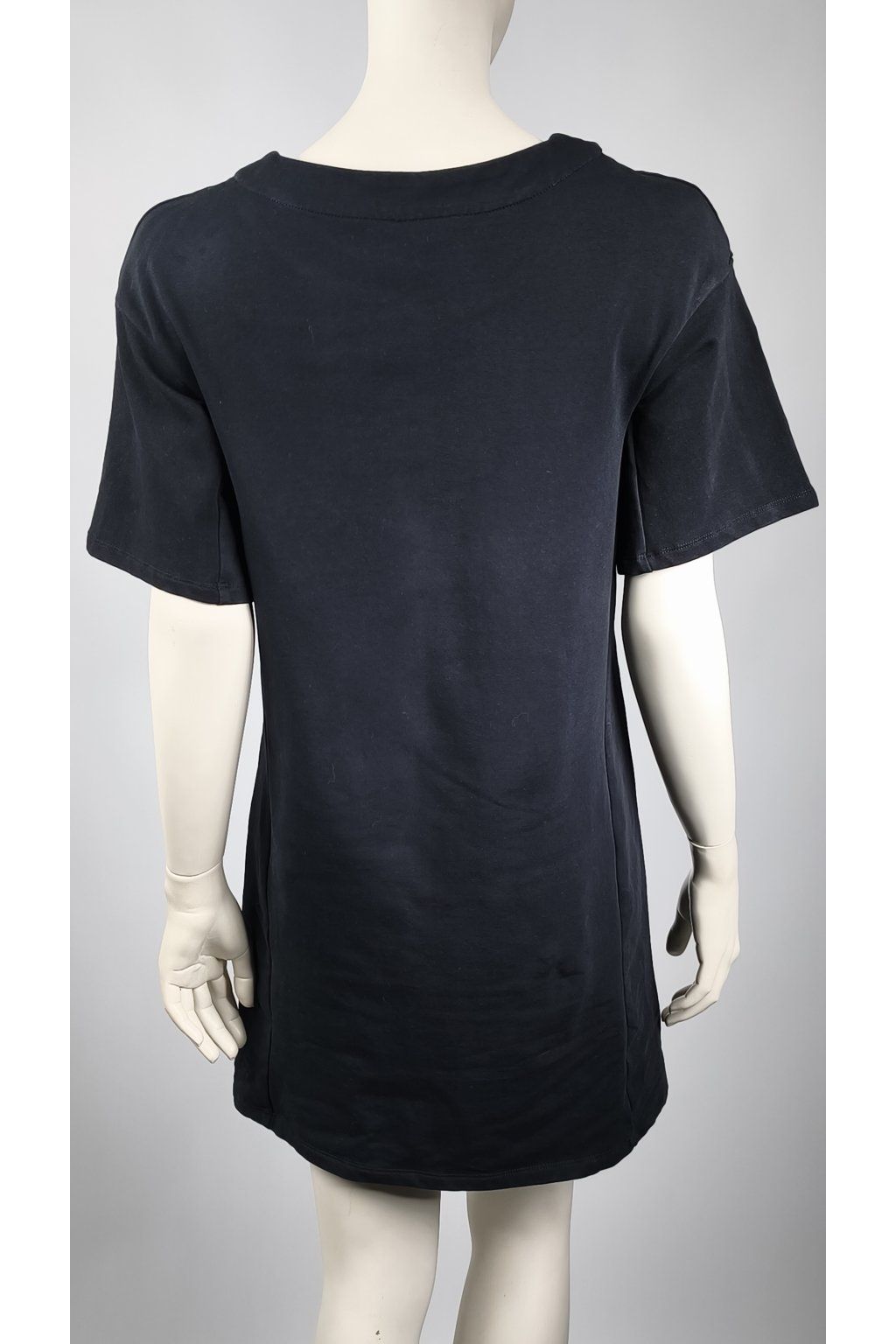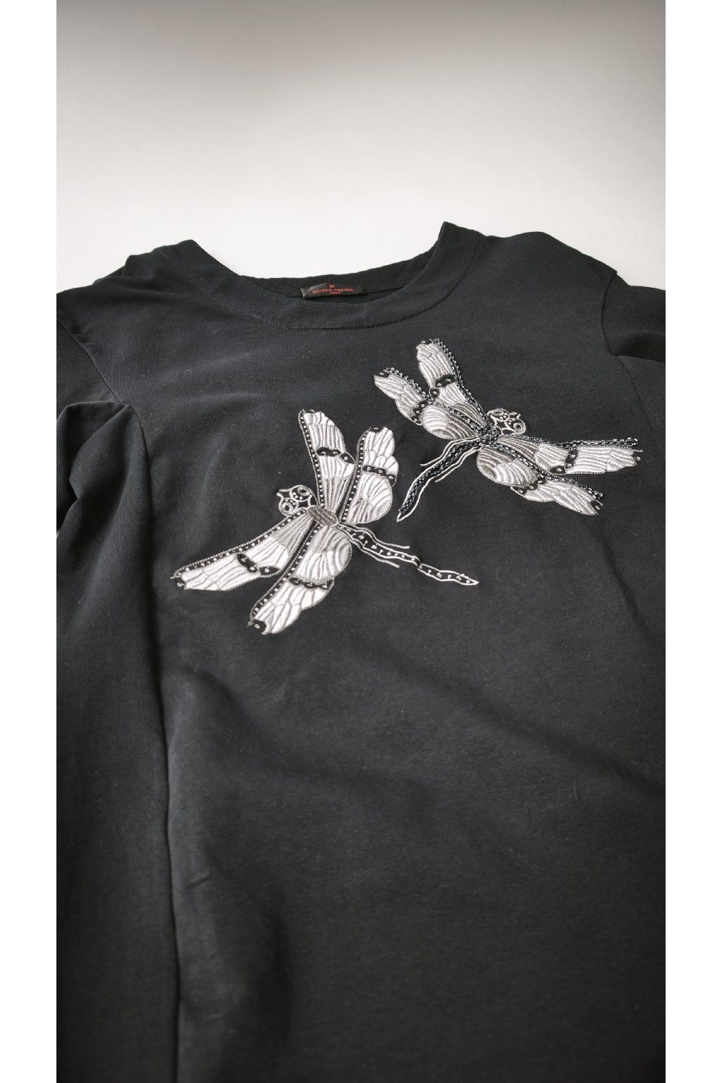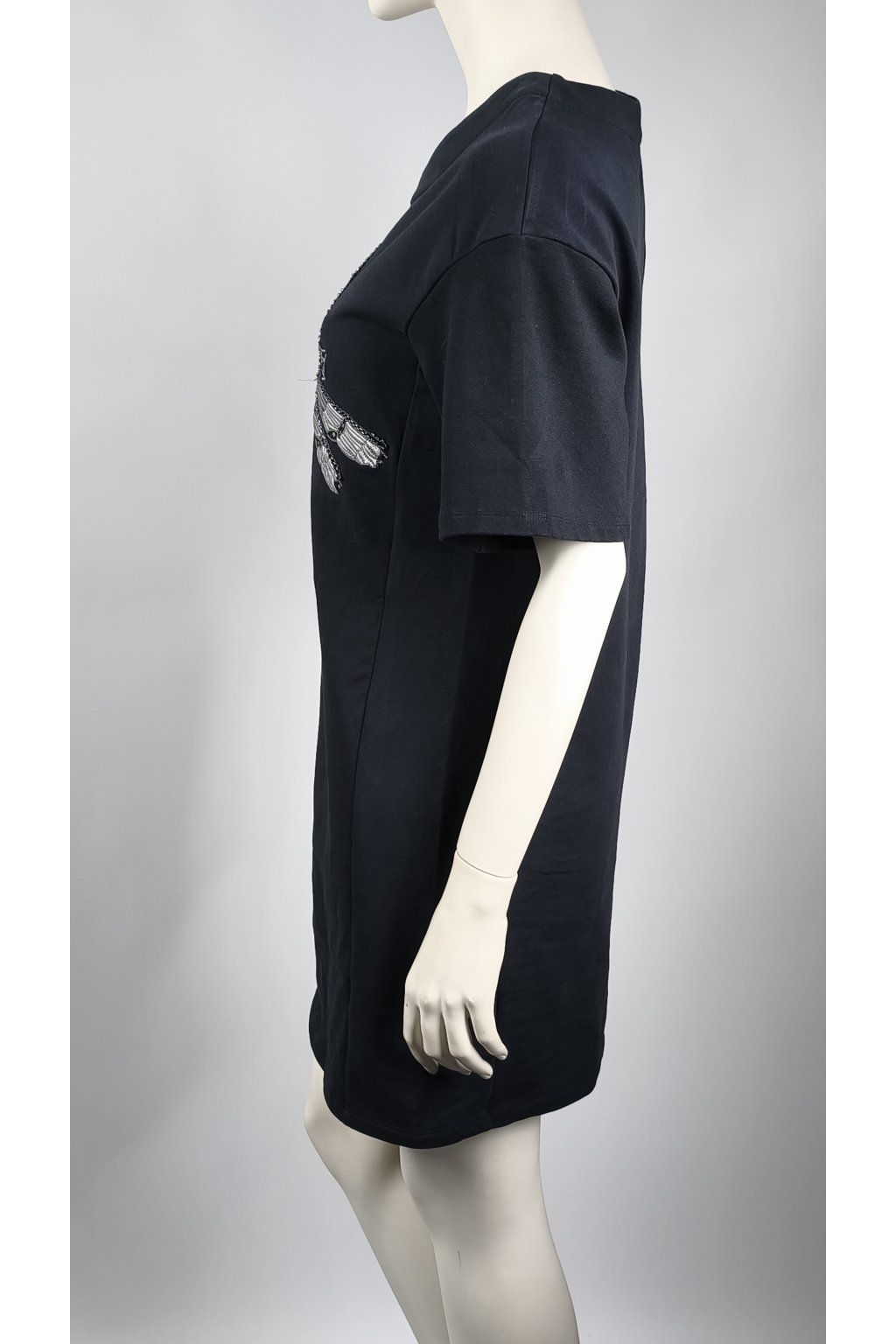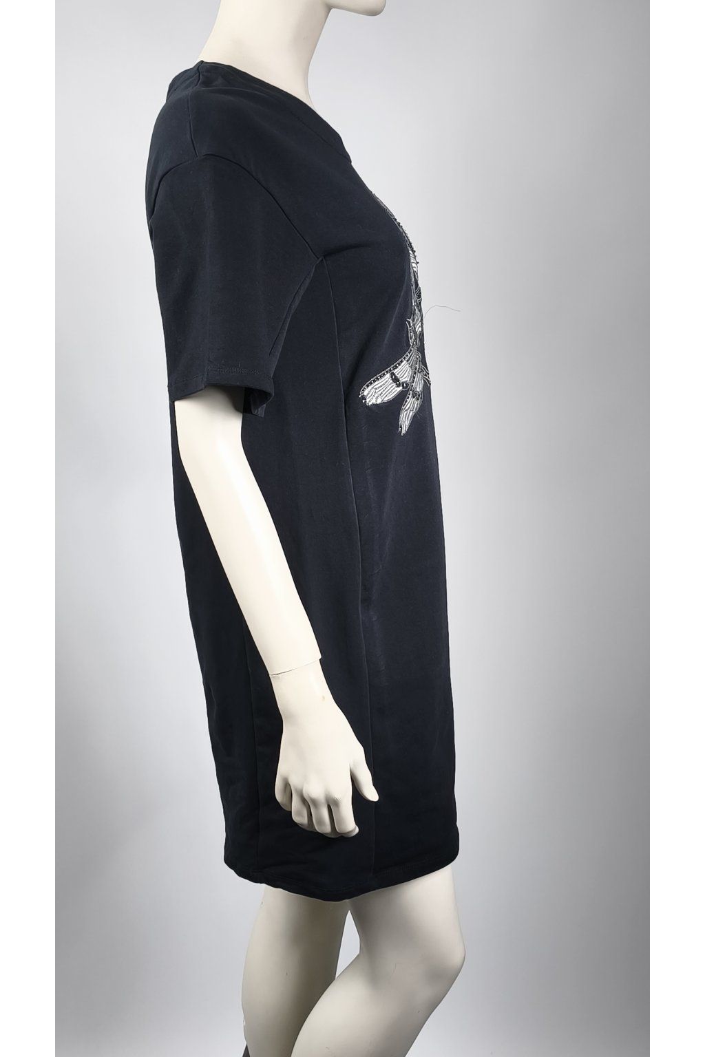 Čierne šaty Pierre Cardin s krátkymi rukávmi zaujmú výraznou potlačou vážok na prednej strane. Pohodlný strih a jemný materiál zaručujú komfort pri nosení.