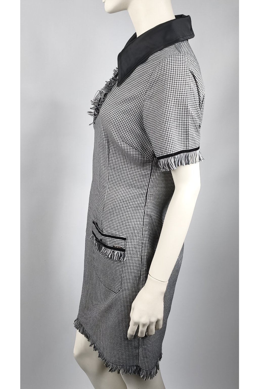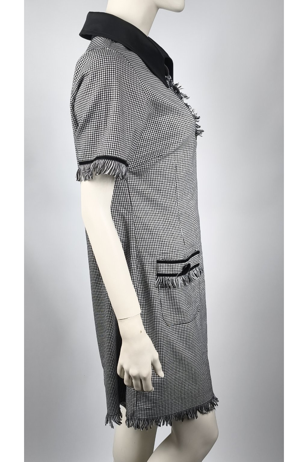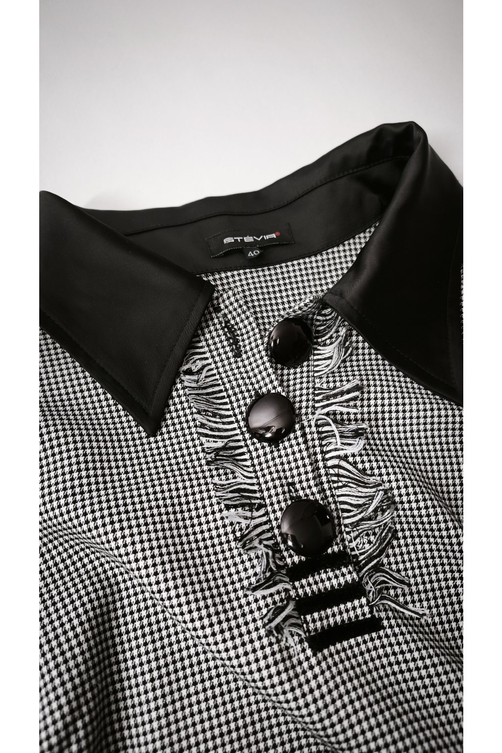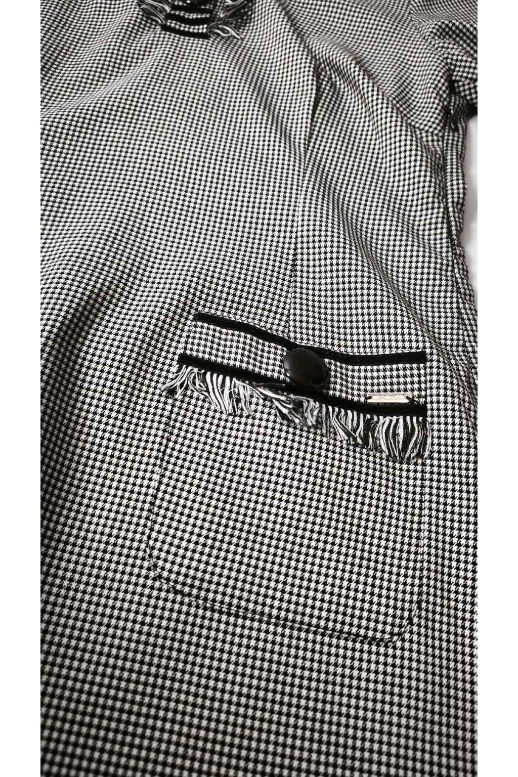 Elegantné šaty v nadčasovom čierno-bielom dizajne s jemným vzorom, ktorý dodáva sofistikovaný vzhľad. Ozdobné veľké gombíky a jemné strapce pri lemoch pridávajú šmrnc. Ideálne na formálne príležitosti alebo pracovné stretnutia.