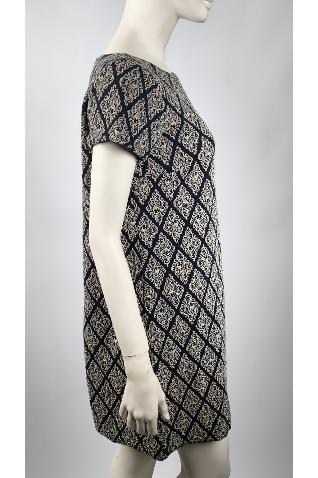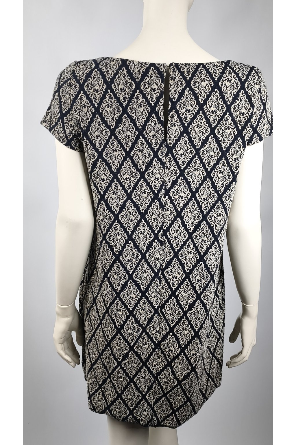 Šaty s krátkymi rukávmi a jemným vzorom v tmavomodrej a bielej farbe dodávajú elegantný vzhľad. Ich jednoduchý strih je vhodný na rôzne príležitosti, pričom vzor vytvára zaujímavý vizuálny efekt.
