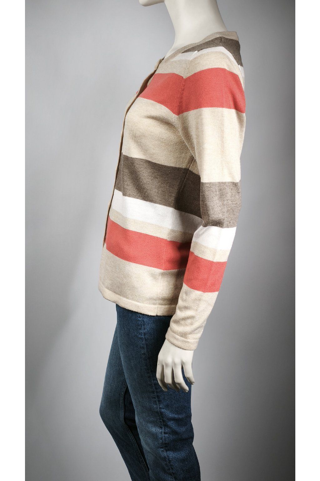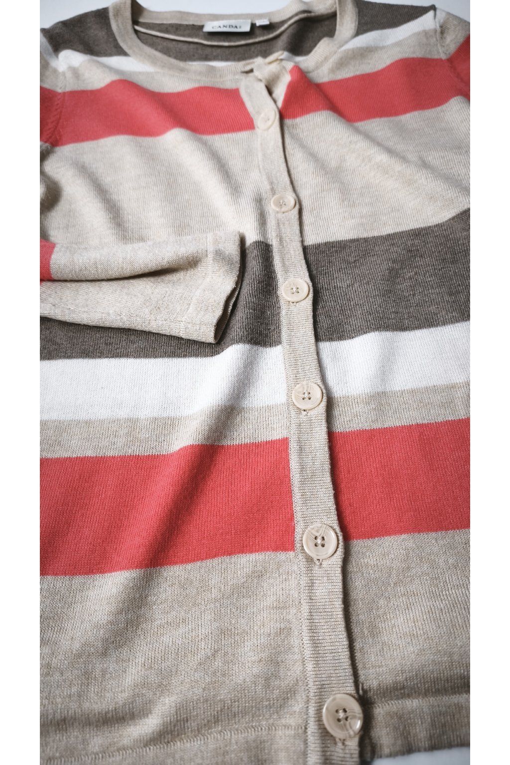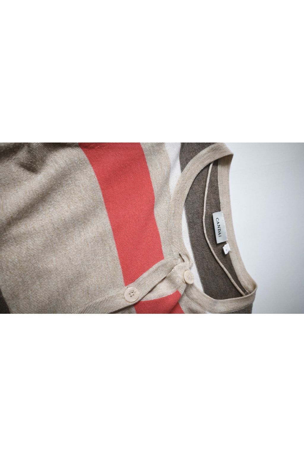 Tento sveter od značky CANDA sa vyznačuje elegantným pruhovaným vzorom v kombinácii zemitých odtieňov s výraznou červenou. Je ideálny na jar a jeseň, vďaka jemnému materiálu a klasickému strihu s gombíkmi.