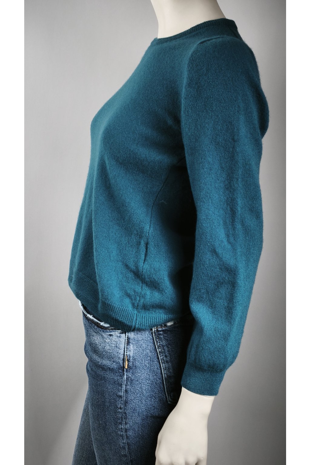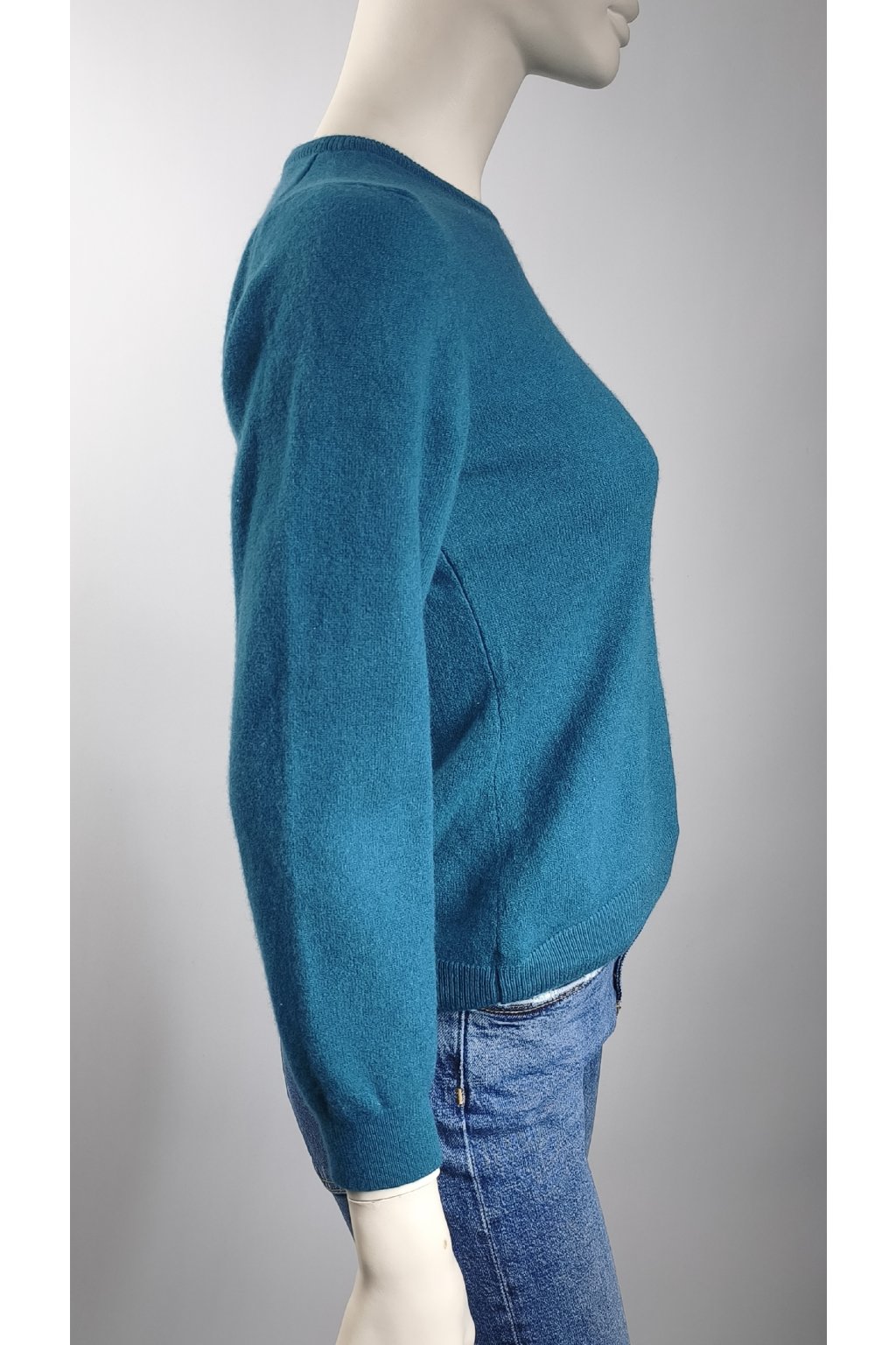 Elegantný modrý sveter z vlny s jemnou vadou.