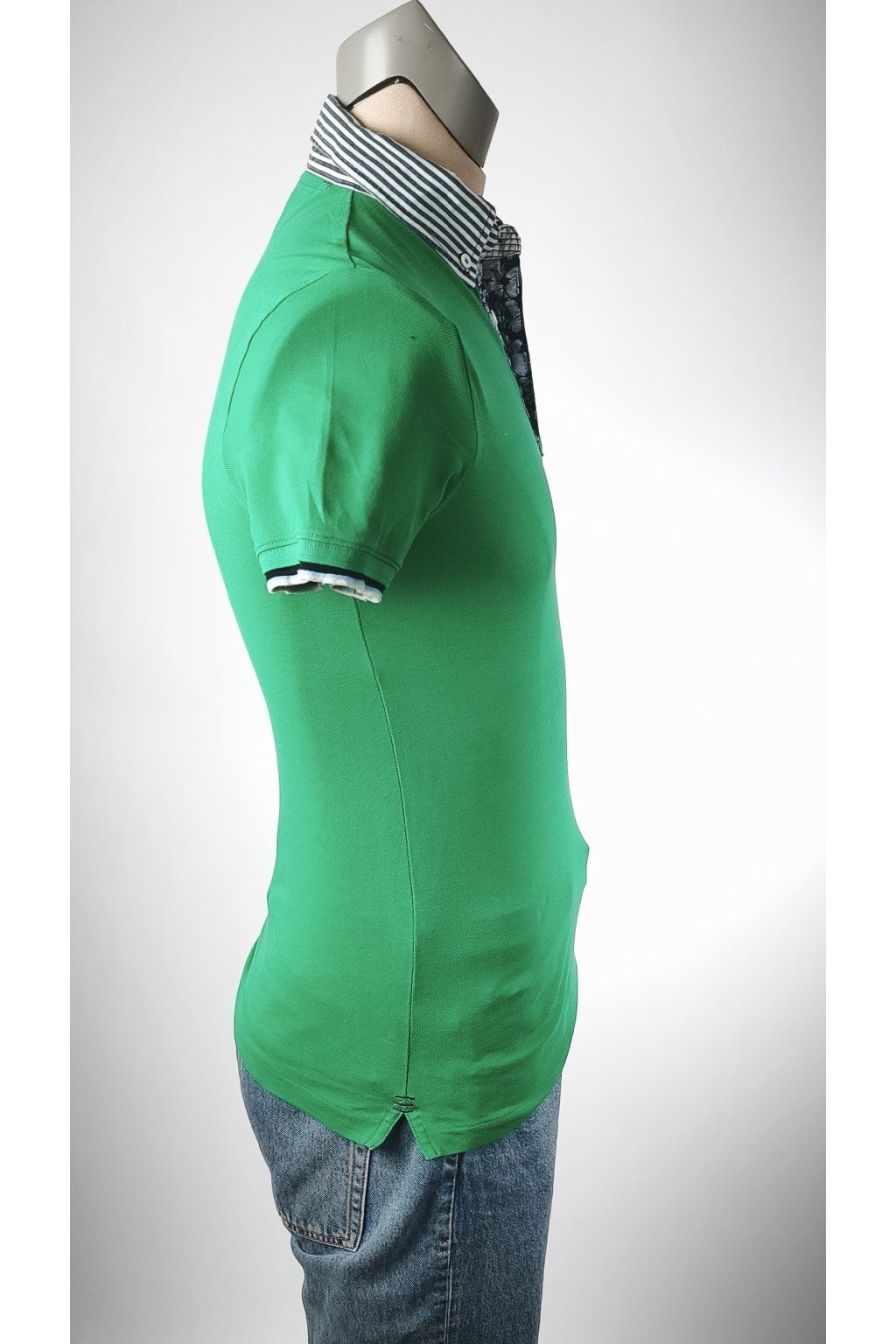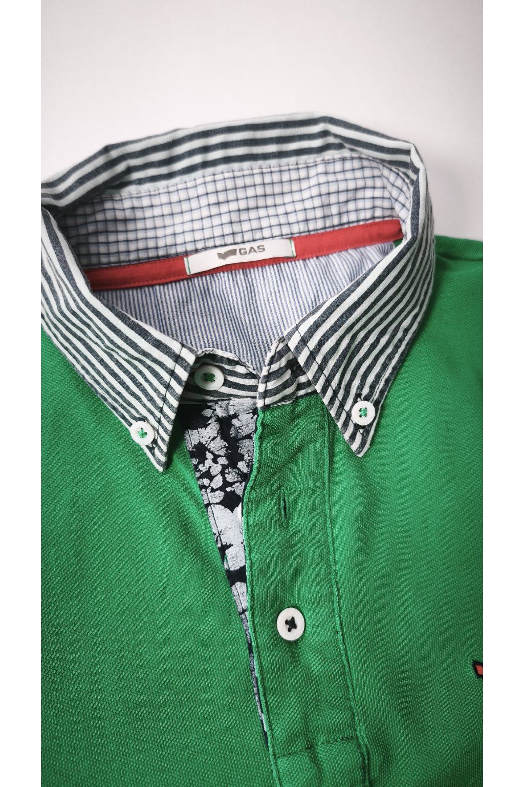 Zelené tričko GAS s kontrastným pásikavým golierom a kvetinovým detailom pri zapínaní. Pohodlný basic kúsok na bežný deň, ktorý oživí každý outfit.