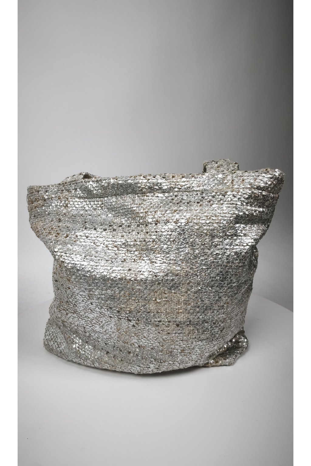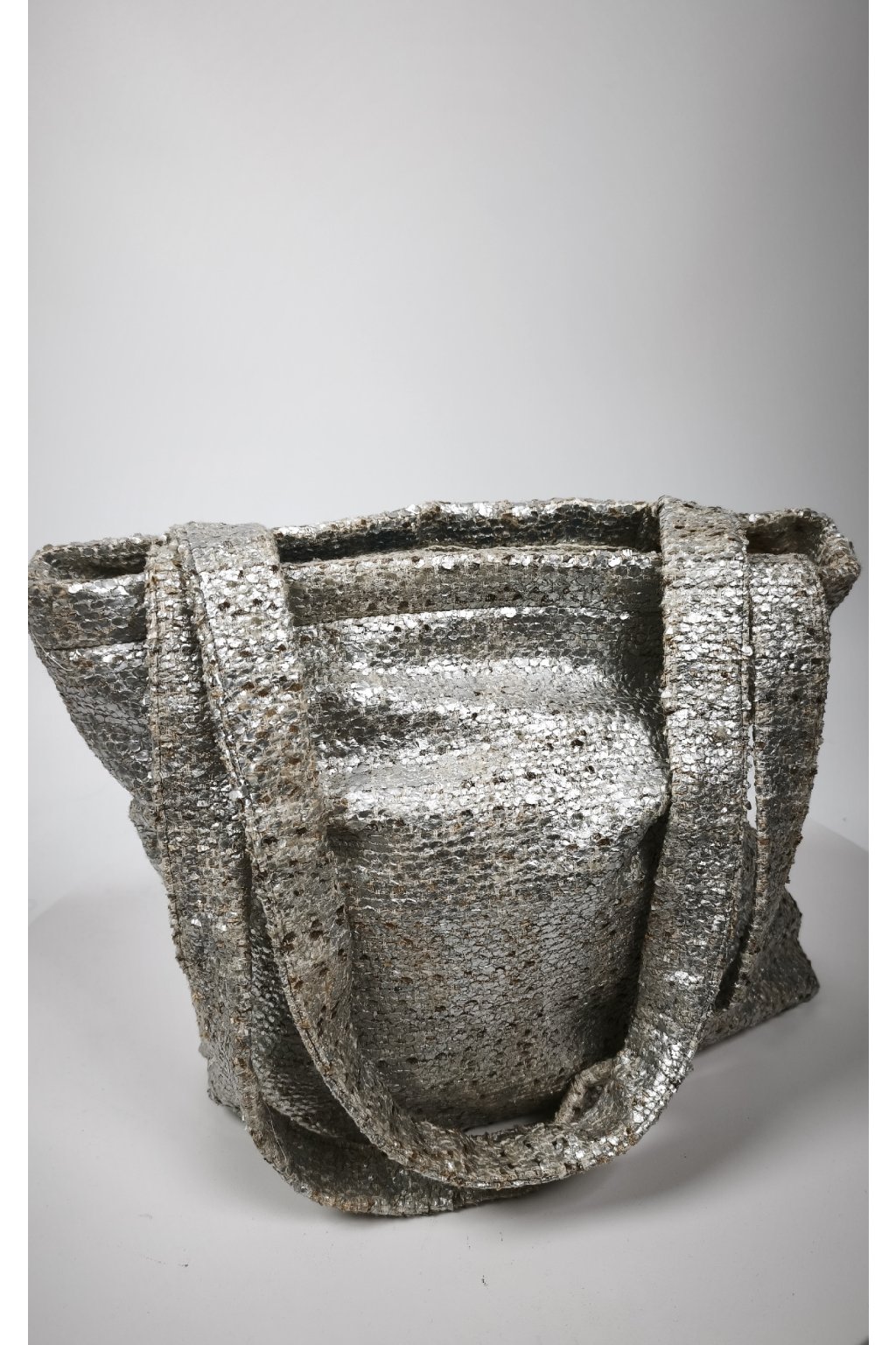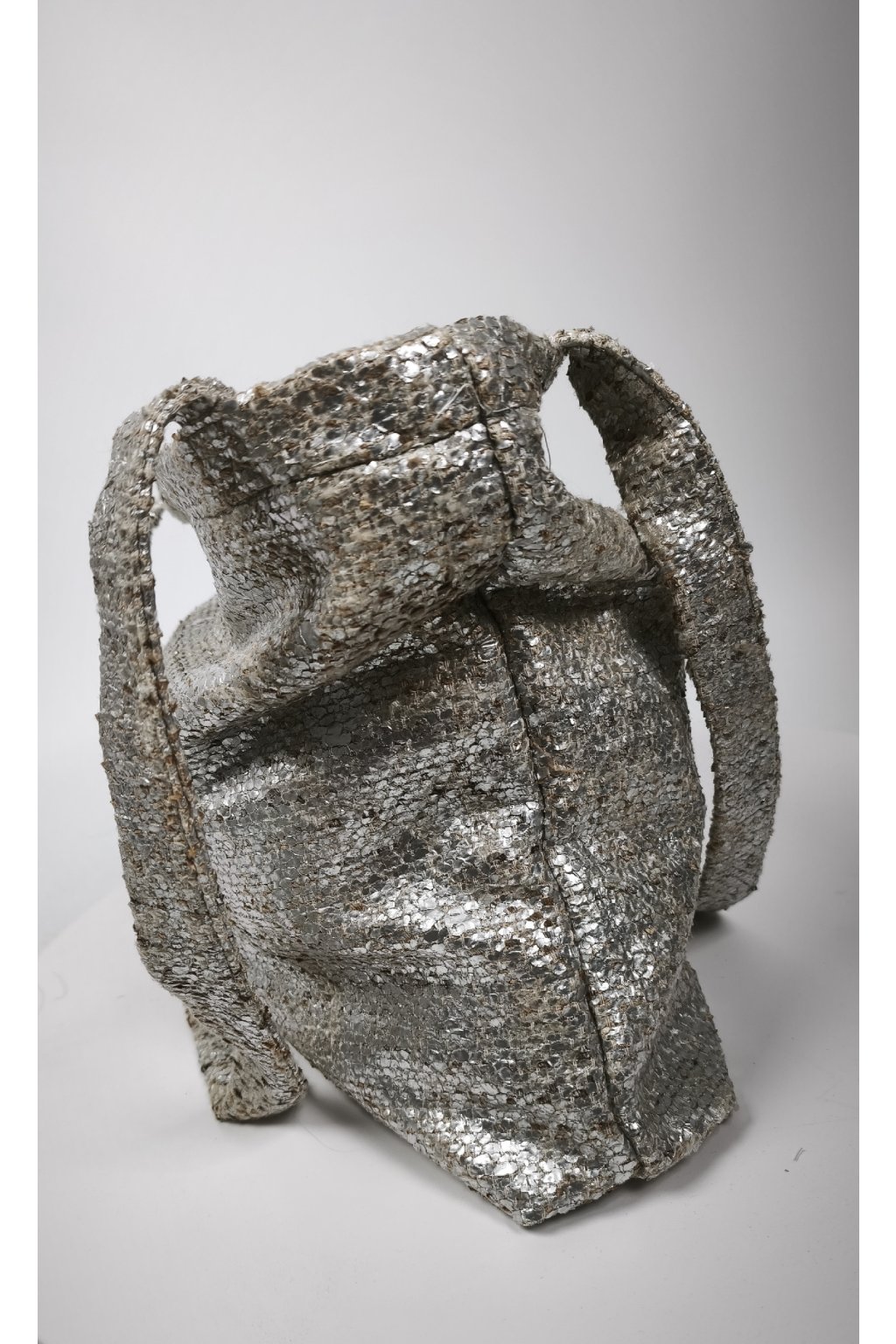 - Materiál: Upcyklovaná textúrovaná látka so strieborným metalickým efektom (100% zachránený materiál).