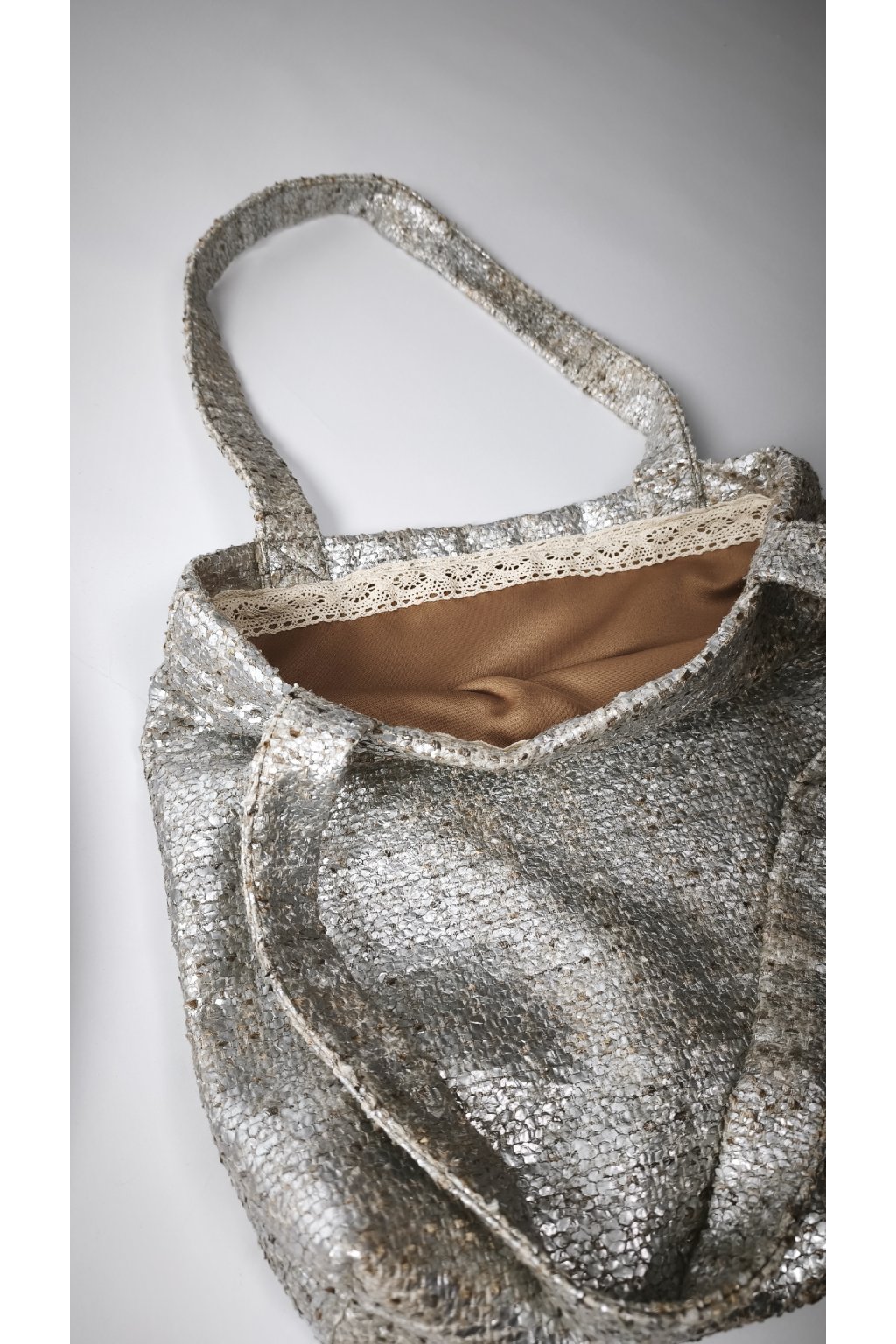Neprehliadnuteľná upcyklovaná shopperka s výraznou striebornou textúrou a prekvapivým romantickým detailom v podobe vnútornej čipky. Tvoj nový "statement" kúsok s príbehom, ktorý bez problémov zhltne všetko od notebooku až po ranný nákup. Smart, priestranná a 100% udržateľná voľba pre tvoj každodenný styling.